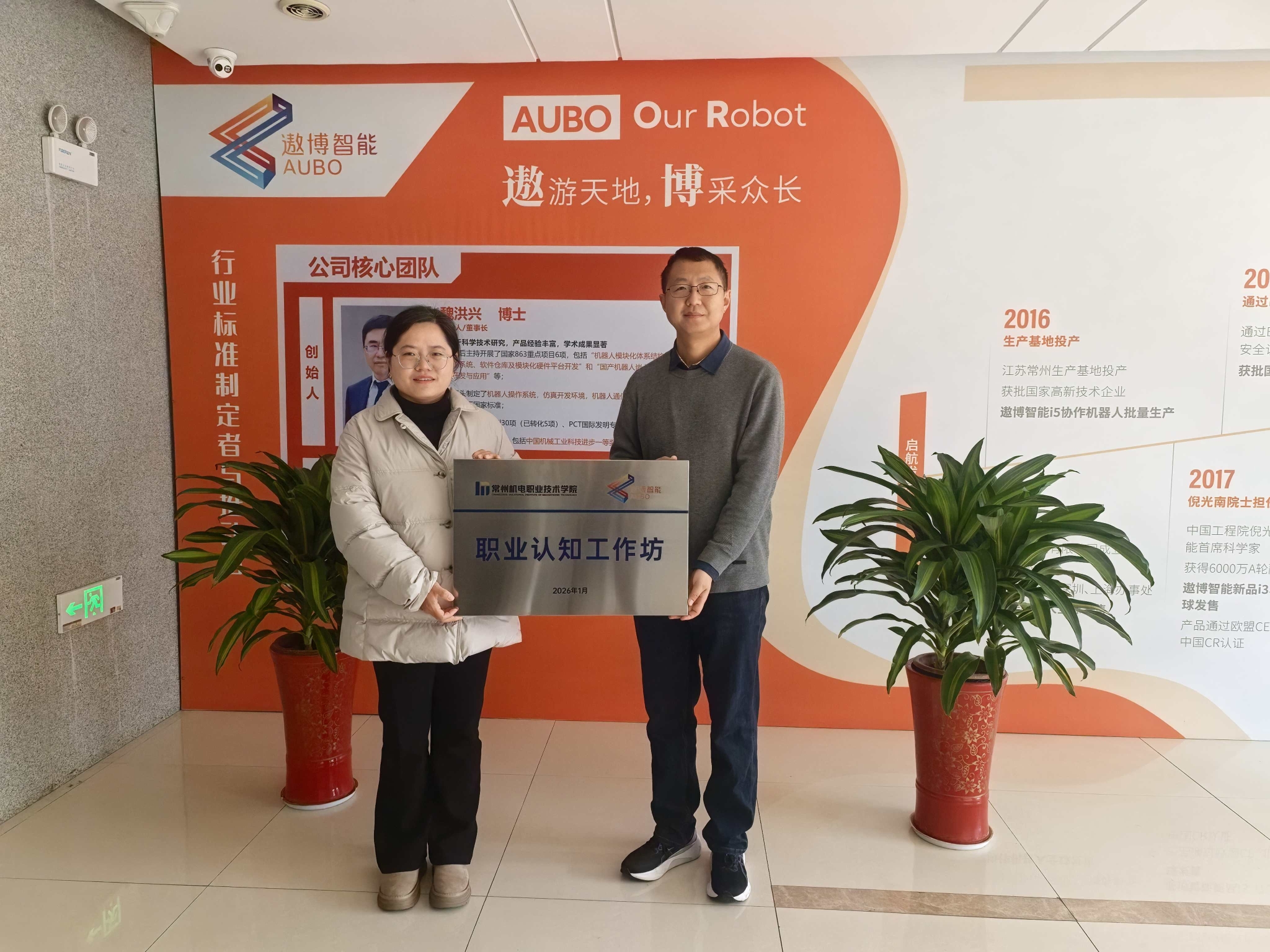 1月8日,电气工程学院副院长谢小敏带领智能机器人专业负责人束攀峰、张紫霞、吴超、贾丽娟及2431级学生代表等20余人,赴遨博(江苏)机器人有限公司开展职业认知活动,并举行“职业认知工作坊”授牌仪式。