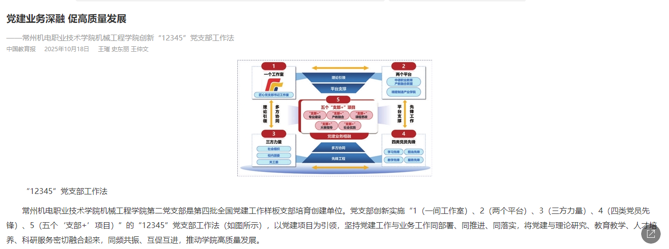 党建业务深融 促高质量发展——常州机电职业技术学院机械工程学院创新“12345”党支部工作法