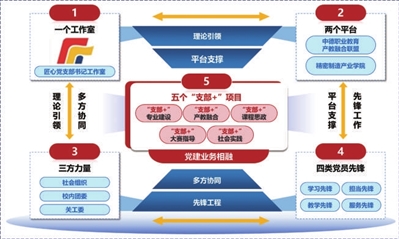 常州机电职业技术学院机械工程学院第二党支部是第四批全国党建工作样板支部培育创建单位。党支部创新实施“1(一间工作室)、2(两个平台)、3(三方力量)、4(四类党员先锋)、5(五个‘支部+’项目)”的“12345”党支部工作法(如图所示),以党建项目为引领,坚持党建工作与业务工作同部署、同推进、同落实,将党建与理论研究、教育教学、人才培养、科研服务密切融合起来,同频共振、互促互进,推动学院高质量发展。