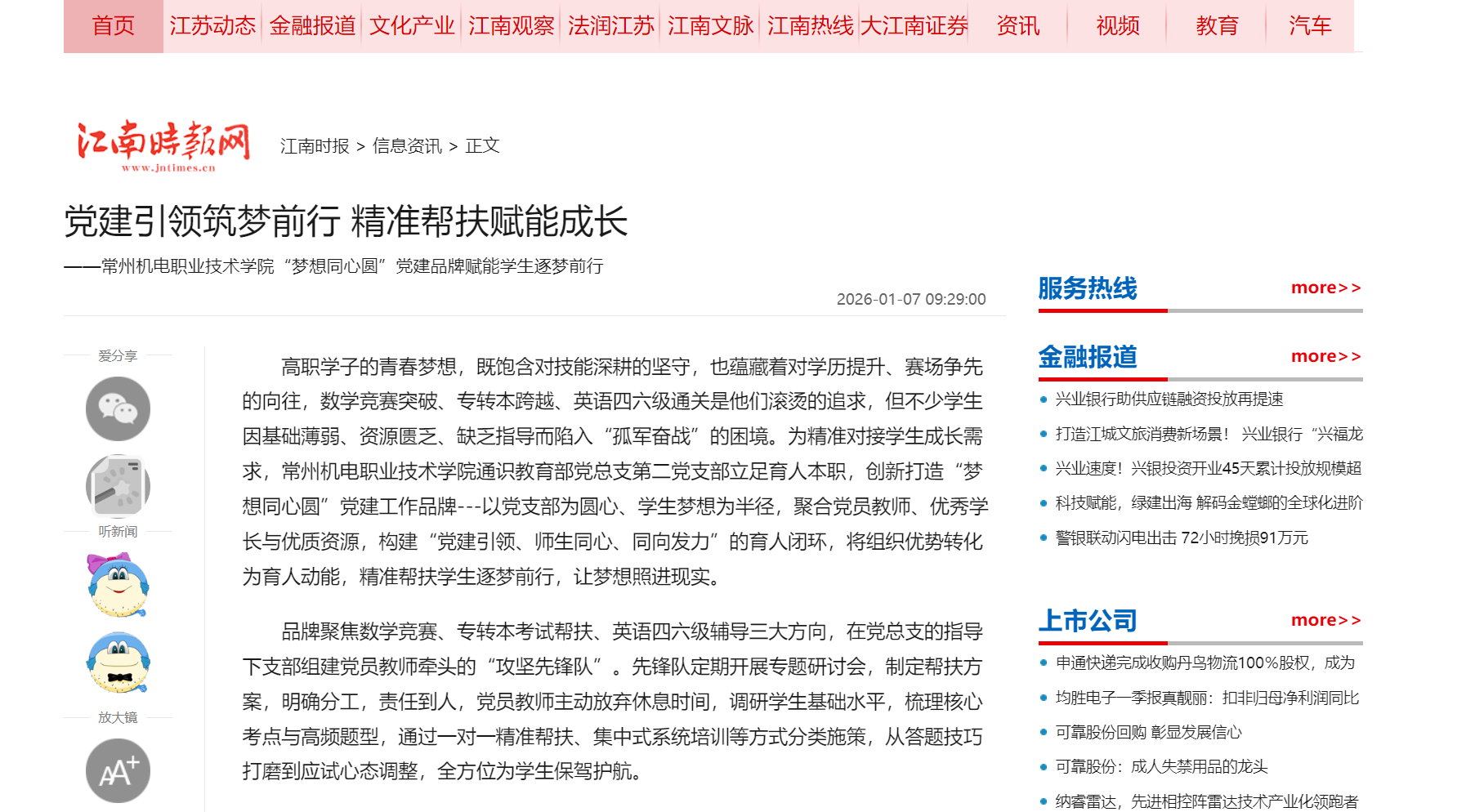 党建引领筑梦前行 精准帮扶赋能成长 ——常州机电职业技术学院“梦想同心圆”党建品牌赋能学生逐梦行