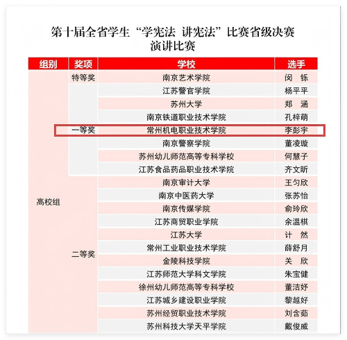 10月18日至19日,第十届江苏省学生“学宪法讲宪法”演讲比赛省级复赛在江苏警官学院举办。我校新能源汽车2435班学生李彭宇脱颖而出,荣获省决赛高校组一等奖,实现了我校在该项赛事中获奖“零的突破”,也是学校依法治校工作的一项标志性成果。