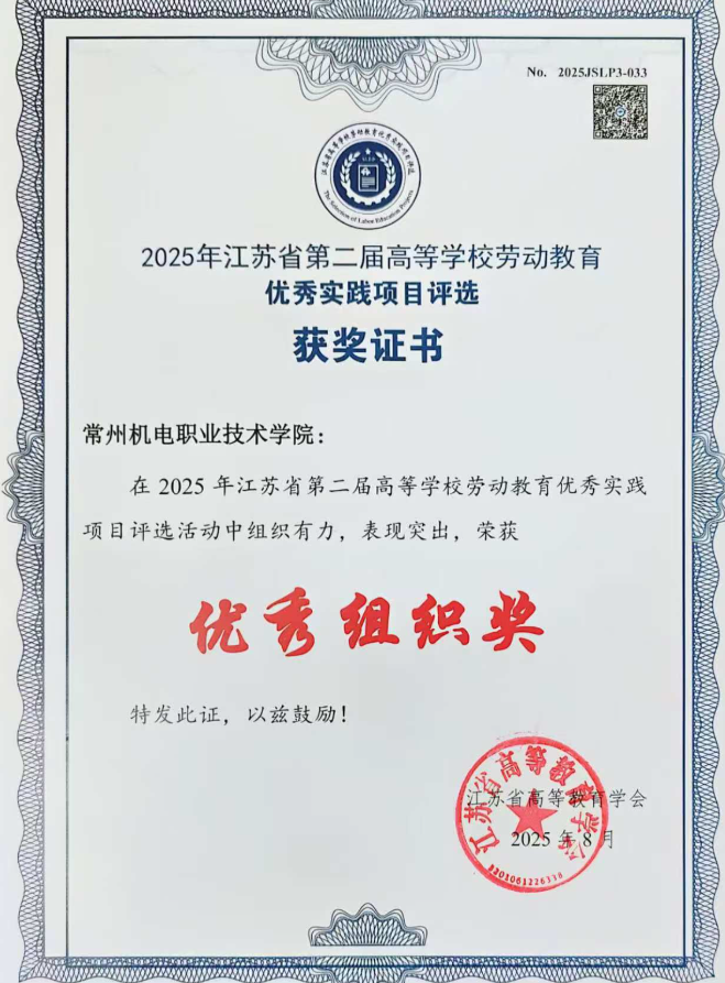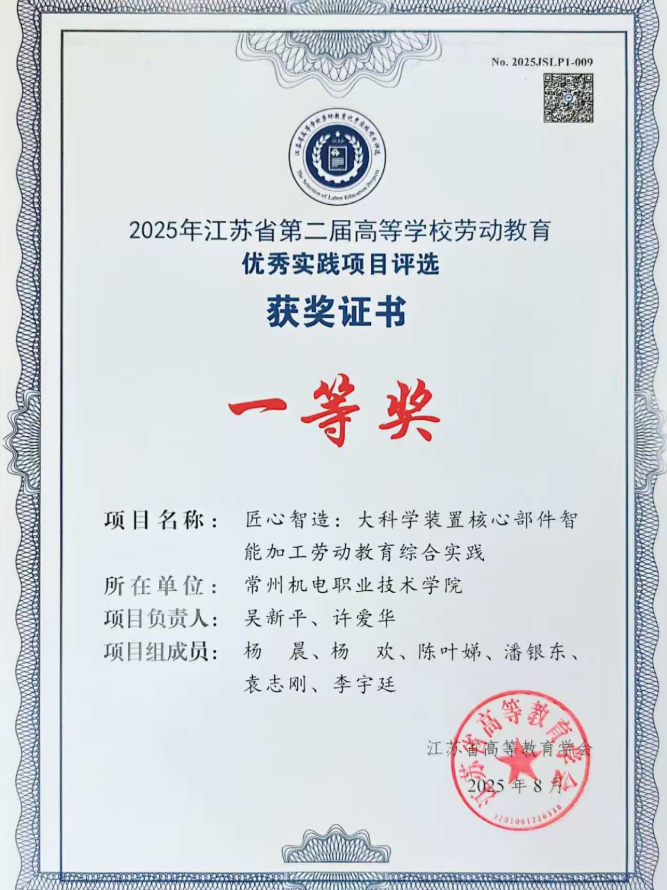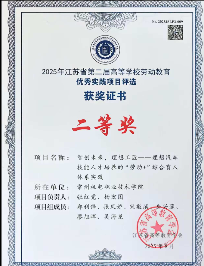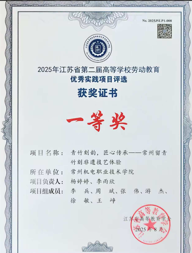 近日,在2025年江苏省第二届高等学校劳动教育优秀实践项目评选中,我校报送的《青竹刻韵,匠心传承——常州留青竹刻非遗技艺体验》《匠心智造:大科学装置核心部件智能加工劳动教育综合实践》荣获一等奖,《智创未来,理想工匠——理想汽车技能人才培养的“劳动+”综合育人体系实践》荣获二等奖,学校获优秀组织奖。