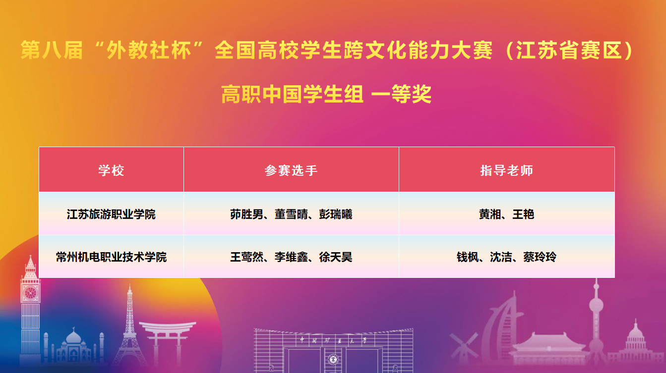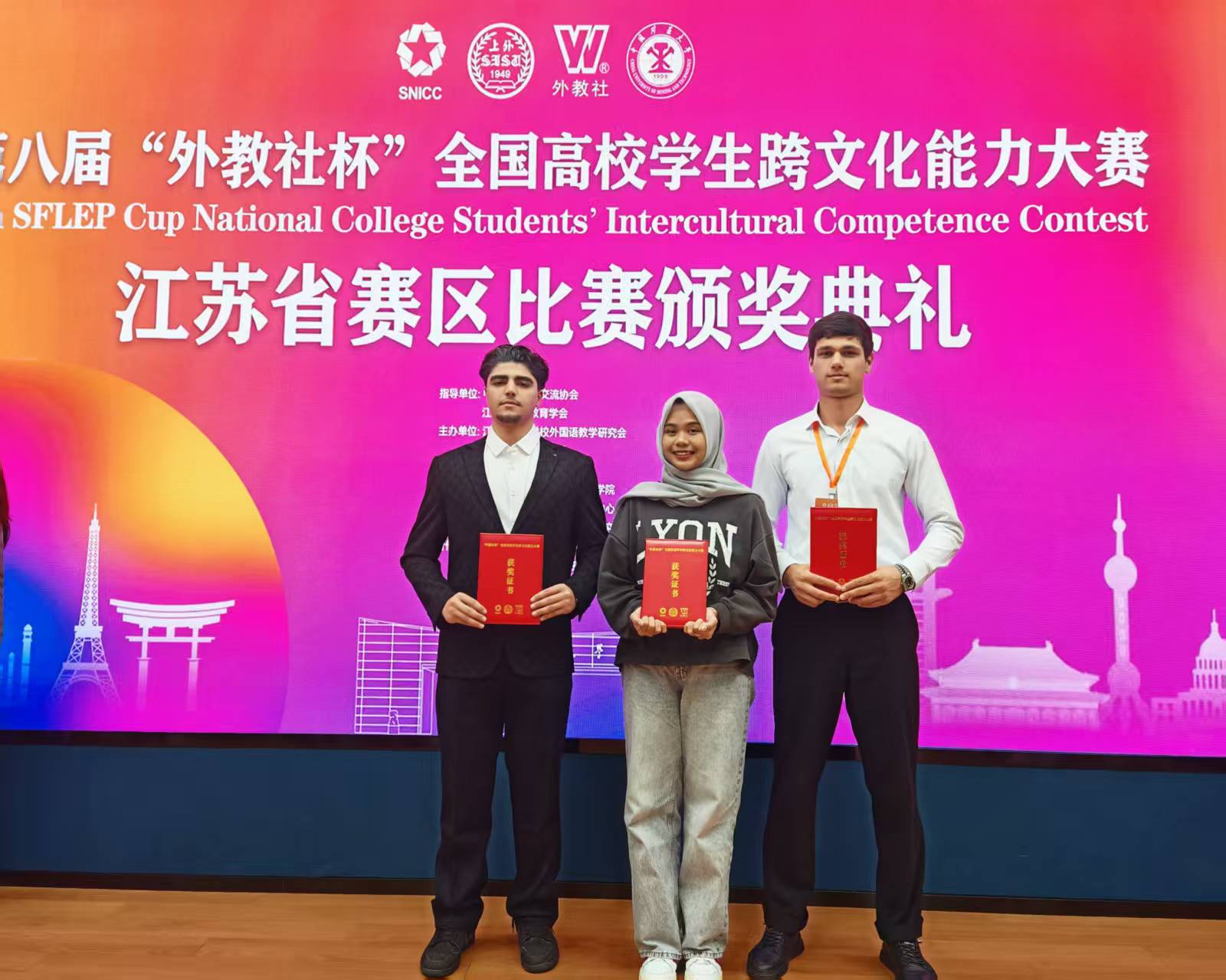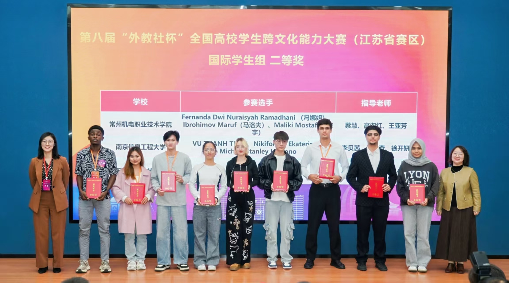 10月24日至26日,第八届“外教社杯”全国高校学生跨文化能力大赛江苏省赛区选拔赛在中国矿业大学举办。由通识教育部教师钱枫、沈洁、蔡玲玲指导,机电2439班徐天昊、李维鑫及跨商2532班王莺然等同学组成的参赛团队,凭借扎实的跨文化知识储备、敏锐的问题分析能力及自信从容的现场表现,获高职中国学生组一等奖。由国际教育学院教师蔡慧、高淑红、王亚芳指导,擎宇、马洛夫及冯娜妲等同学组成的参赛团队获得国际学生组二等奖。