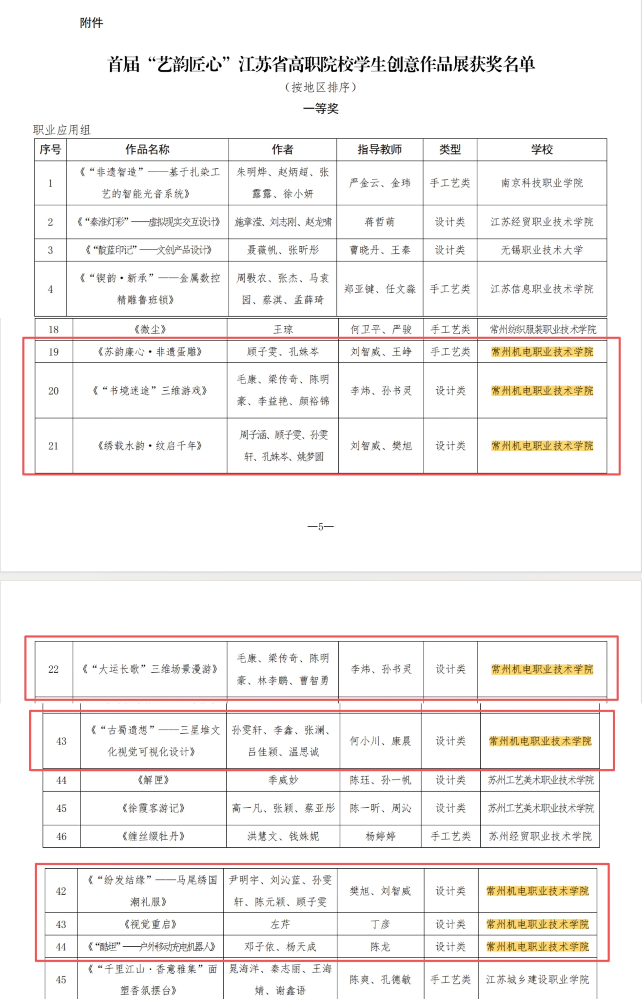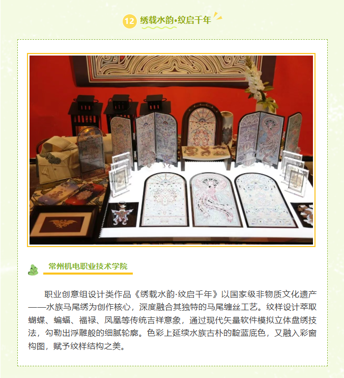 10月28日,江苏省教育厅公布首届“艺韵匠心”江苏省高职院校学生创意作品展获奖名单。我校学生作品在本届展览中荣获一等奖4项、二等奖1项、三等奖3项。其中,3件作品入选“观众最喜爱的作品TOP20”,充分展现了我校美育工作的扎实成果与育人实效。