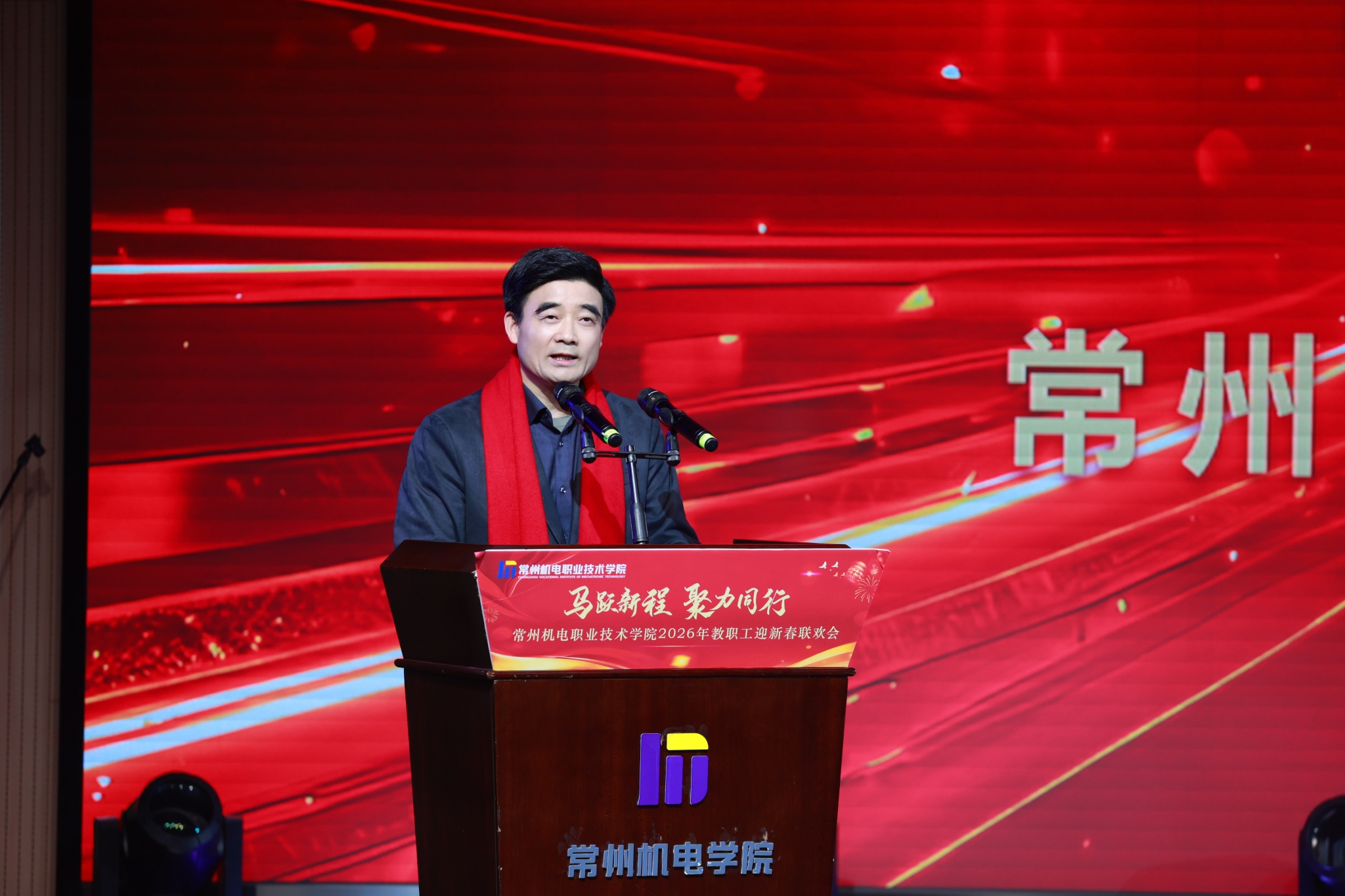 校党委书记许朝山致辞。他代表学校党委和行政领导班子向辛勤耕耘在教学、科研、管理、服务一线的全体教职工及家属致以诚挚的新春问候。他分享了三个凝聚人心的关键词:“乐”——乐以忘忧,勉励全体教职工在忙碌工作中保持快乐心态,享受生活;“家”——家和业兴,回顾了2025年学校取得的丰硕成果,感谢每位教职工对“大家庭”的辛勤付出;“进”——进无止境,号召全体常机电人继续秉持“一德一心、责先利后、砥砺琢磨、勇争一流”学校精神,凝心聚力,锐意进取,以更加务实的作风推动学校各项事业再上新台阶,为服务地方经济社会发展作出新的更大贡献。
