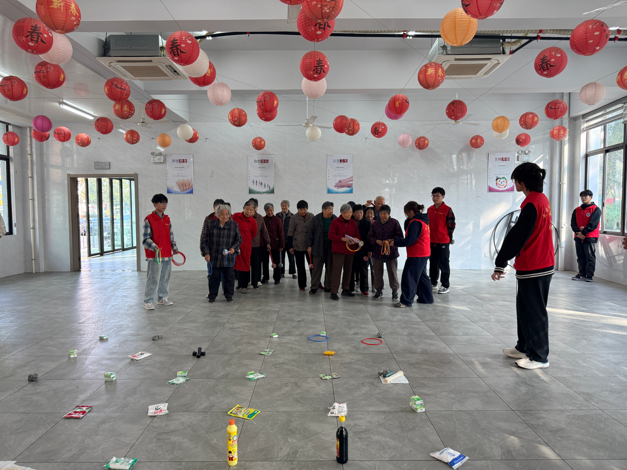 志愿者将亲手制作的艾草锤逐一赠予老人,细致讲解养生功效与按摩技巧,并带领长辈们做舒缓养生操,轻柔动作间舒缓筋骨。投壶游戏中,老人们凝神屏息,认真投掷。套圈摊位还为老人们准备了各类常见生活用品。爱心关怀专区内,志愿者针对视频通话、微信语音、字体调节等需求,手把手教学,耐心答疑。