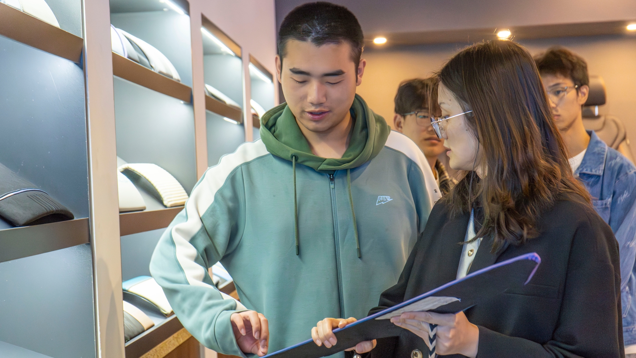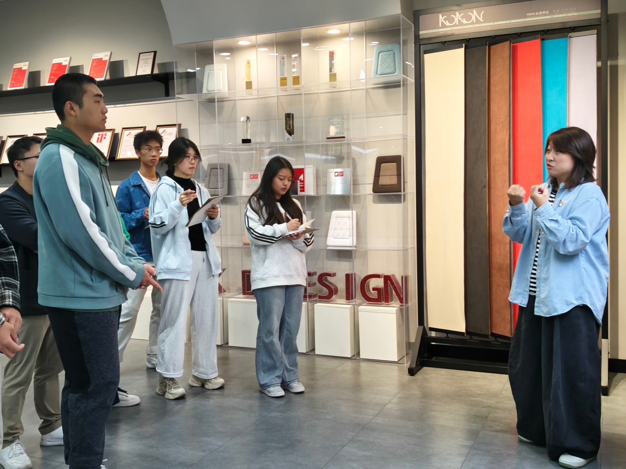师生们在企业代表的引导下参观了旷达科技集团的CMF创新展厅与公司发展史馆。丰富的面料样本、前沿的设计应用以及企业厚重的发展历程,让同学们直观感受旷达集团在核心材料、表面处理及色彩趋势等领域的深厚积淀与创新活力,对企业实际运营和行业技术前沿有了更为具象的认识。
