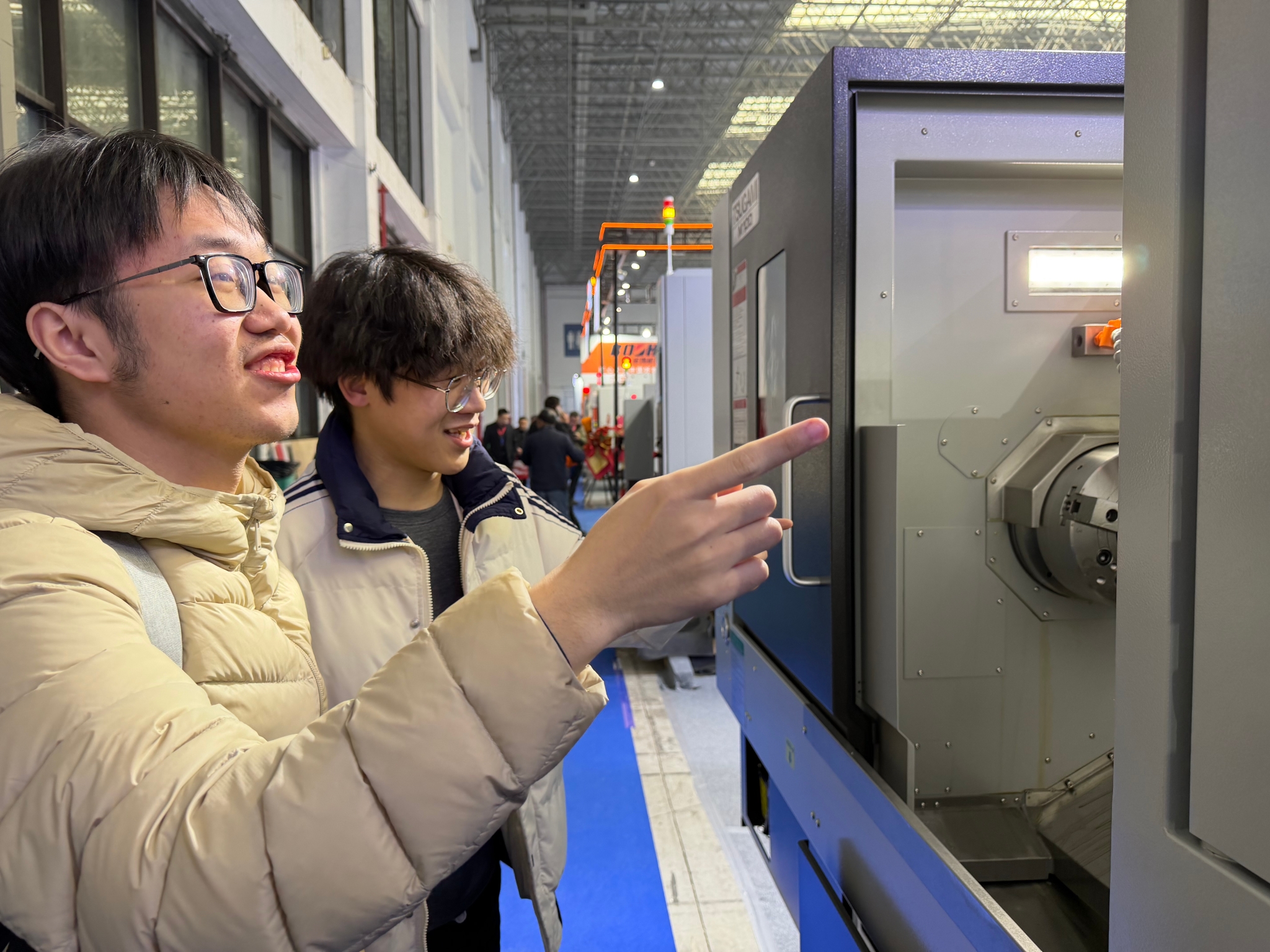 参观现场,同学们驻足五轴联动加工中心等展品前,聆听企业技术人员讲解,围绕加工工艺优化、设备智能运维、行业人才需求等问题深入交流,对照课本知识查漏补缺,打通理论学习与产业实践的壁垒。机制2437班杨家豪表示,此次参观让自己更加明确,想要成为合格的青年工匠,既要扎实学好专业知识,更要沉下心苦练实操技能,用劳动打磨本领,用匠心成就未来。