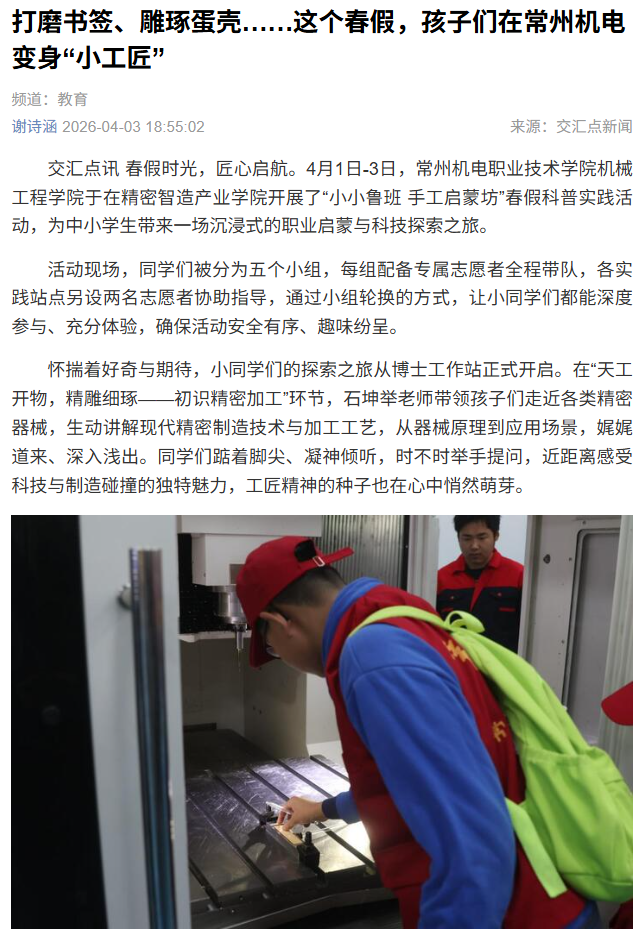 交汇点讯 春假时光,匠心启航。4月1日-3日,常州机电职业技术学院机械工程学院于在精密智造产业学院开展了“小小鲁班 手工启蒙坊”春假科普实践活动,为中小学生带来一场沉浸式的职业启蒙与科技探索之旅。