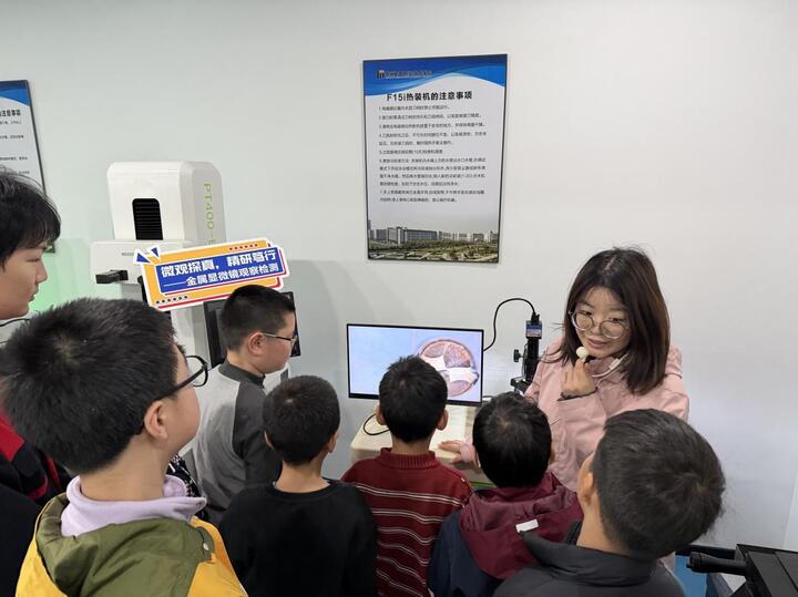 活动的最后一站,孩子们走进实训室,开启“微观探真,精研笃行——金属显微镜观察检测”的微观世界探索。饶淼淼老师先为孩子们讲解金相显微镜的操作规范与金属材料的相关知识,再指导大家亲手操作,观察、分析金属材料的显微组织。当原本看似普通的金属,在显微镜下展现出千姿百态的微观结构,同学们都露出了惊奇的表情,解锁了微观世界的全新认知。