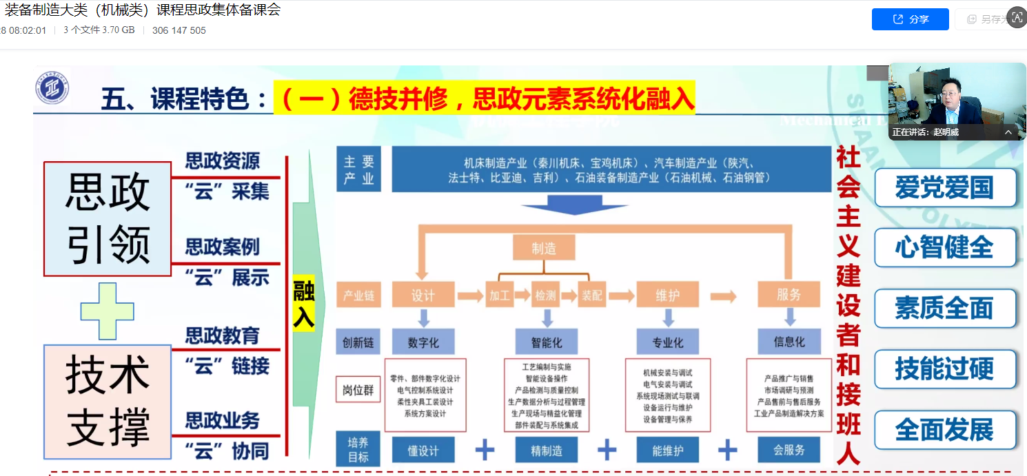 本次备课会以“深化课程教材思政建设,培育制造强国技术人才”为主题,包括专家领学、说课展示、点评研讨三大环节,旨在通过政策解读、经验分享、说课展示和专家点评,推动装备制造类课程思政与教材一体化建设。
