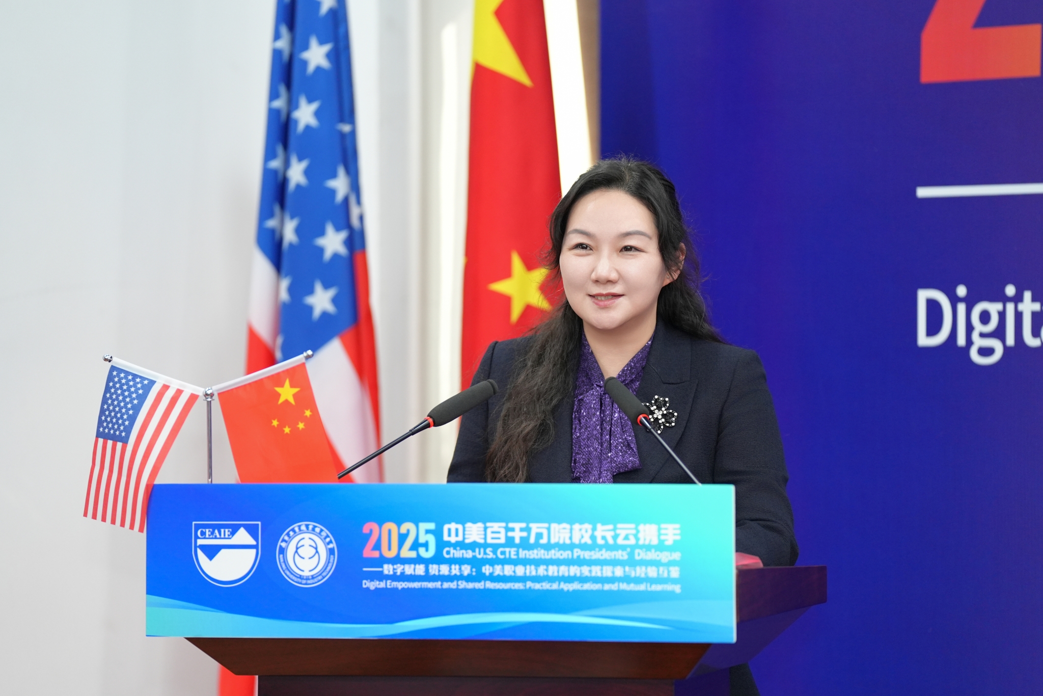 在“中美职业技术教育合作高质量发展路径探索”专题研讨环节,刘畅以《技术应用型人才共育 产教融合生态共建——双螺旋中美职教合作的探索实践》为题,系统介绍了学校对美合作成果。她表示,学校通过标准引领、平台共建、团队互融、资源共享的螺旋互动机制,推动双方在智能制造、人工智能等领域深度合作。依托国家级平台和省级外国专家工作室,累计选派近40名教师赴美交流,并通过“2+1”双学历等项目强化学生国际素养。未来,学校将继续拓展跨境电商、新能源汽车等新兴领域合作,推进课程标准互认与数字化资源共建,为中美职教协同发展注入新动能。
