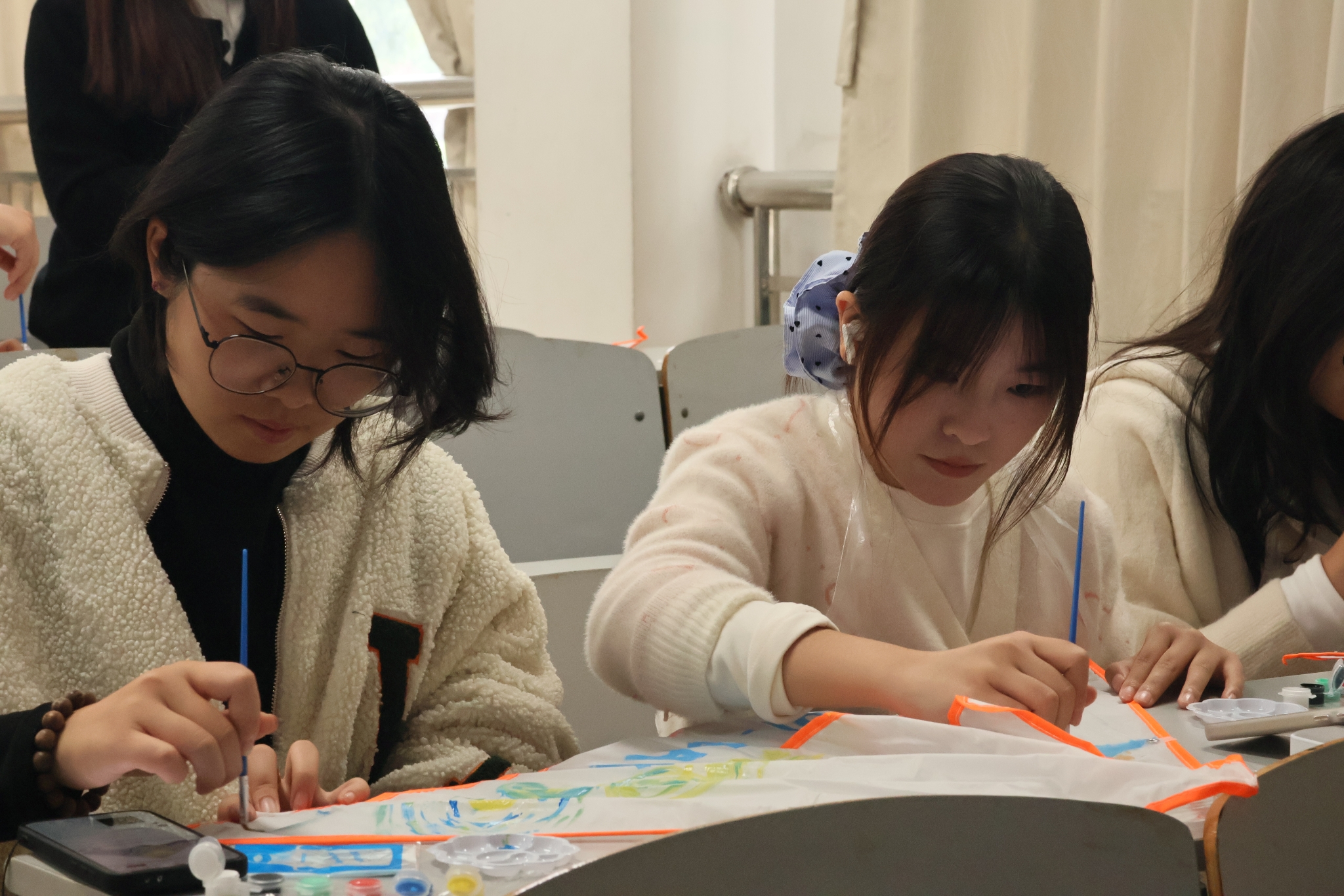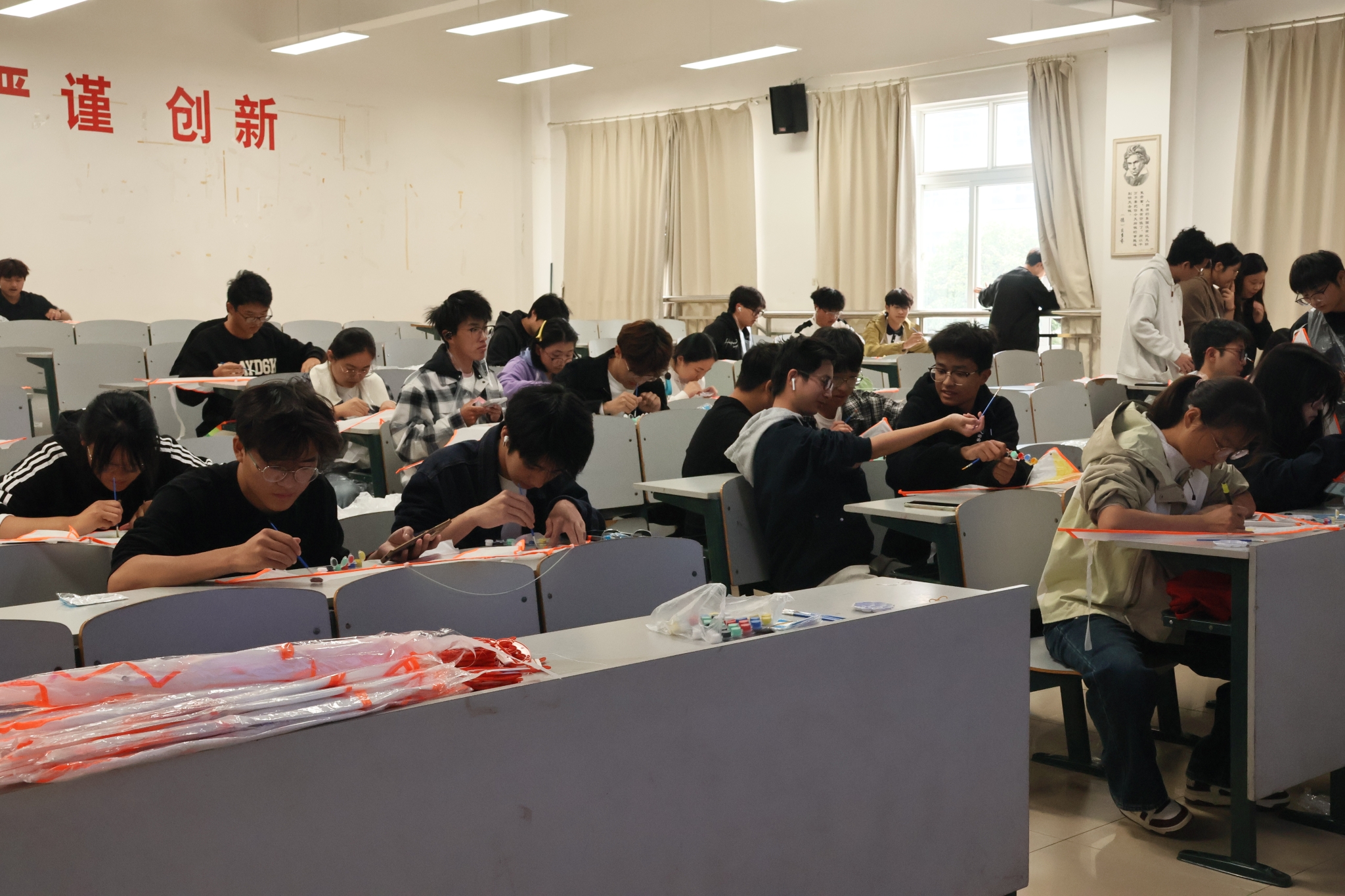 活动介绍了重阳节“祈福、欢聚”的核心内涵,结合实物演示讲解风筝制作的关键步骤与安全注意事项,确保每位同学都能掌握操作要点。DIY创作环节中,同学们自发分组、分工协作,对大学生活的期许融入图案设计,展现出新生们的创意与活力。