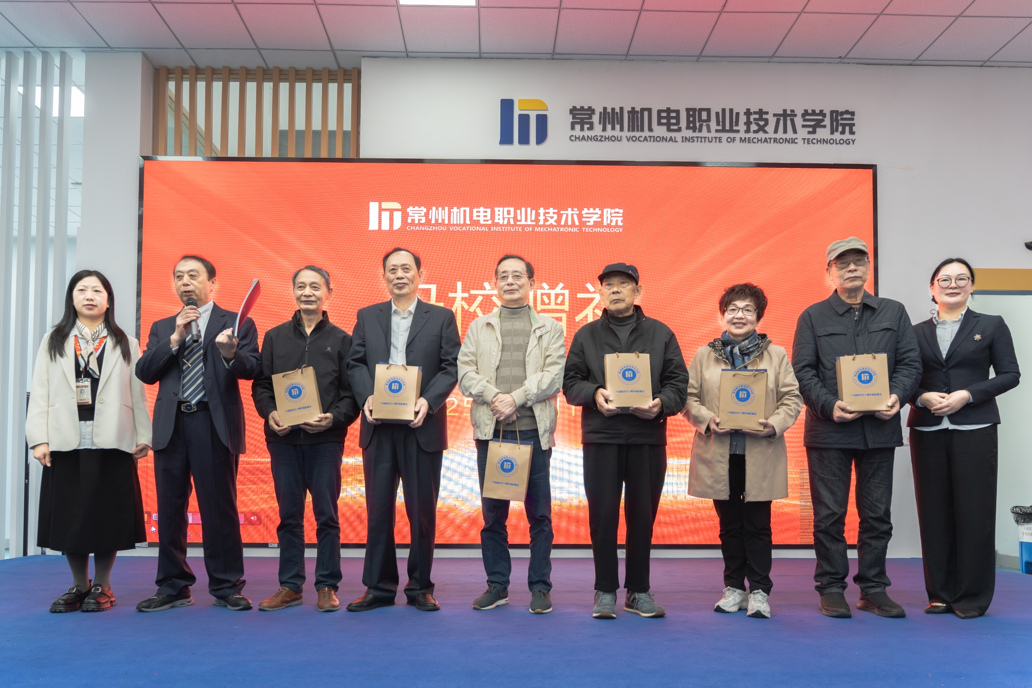 在捐赠环节,74级电气班张建强校友向学校赠送纪念手册,刘刚代表校友办接收。陈叶娣等向74级校友代表赠送纪念品,象征着母校与校友之间深厚情谊的延续。