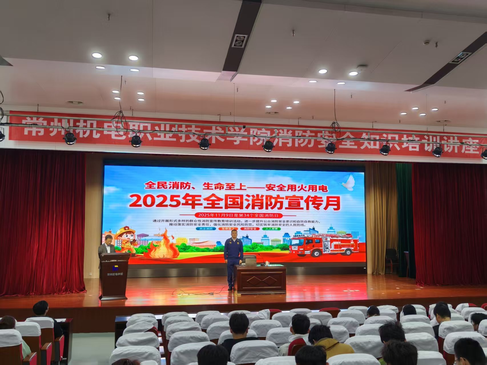 为切实落实2025年消防宣传月“全民消防、生命至上——安全用火用电”的活动主题,提升全校师生消防安全意识与风险防范能力,11月5日下午,学校在图书馆红厅举办“高校消防用火用电安全”专题讲座。本次讲座由武进区消防大队消防救援站站长王传超主讲,各部门安全员、新进辅导员、第三方服务单位负责人及工作人员、校中厂安全员和各二级学院学生代表参加。