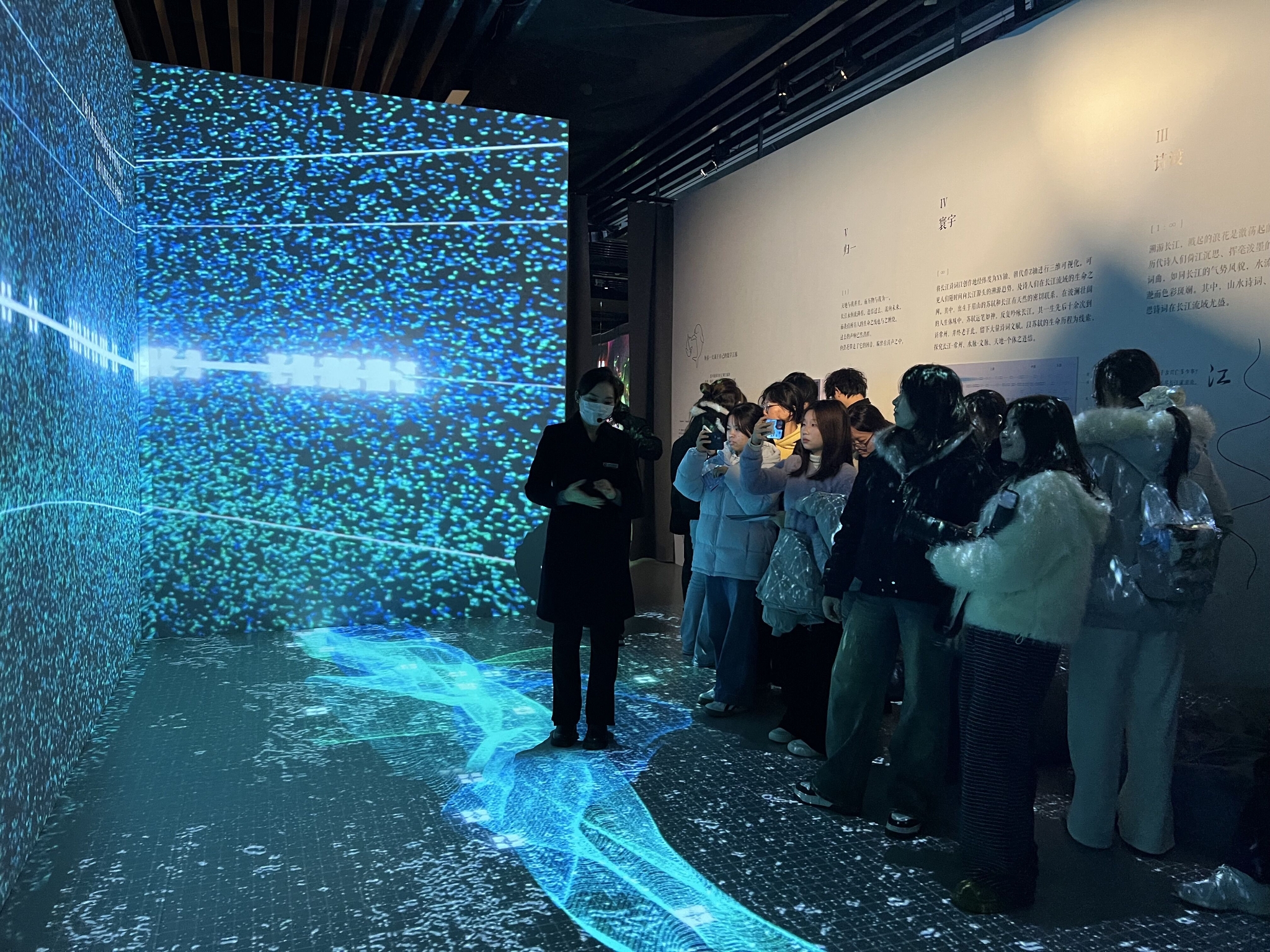 在寺墩古国展中,学生们驻足于距今约5000年的玉琮纹饰前,其外方内圆的造型与兽面纹构成的几何美学,为学生们提供了设计灵感。在《何以长江》数字展中,学生们通过互动装置、多媒体影像、生成艺术等形式,沉浸式体验长江的源流、生态、诗意及城市关联。苏轼的“横看成岭侧成峰,远近高低各不同”的诗句化作光影粒子随长江奔涌流动,这种“科技解码文明,设计反哺生态”的双向互动,正重塑着艺术设计专业的价值坐标。