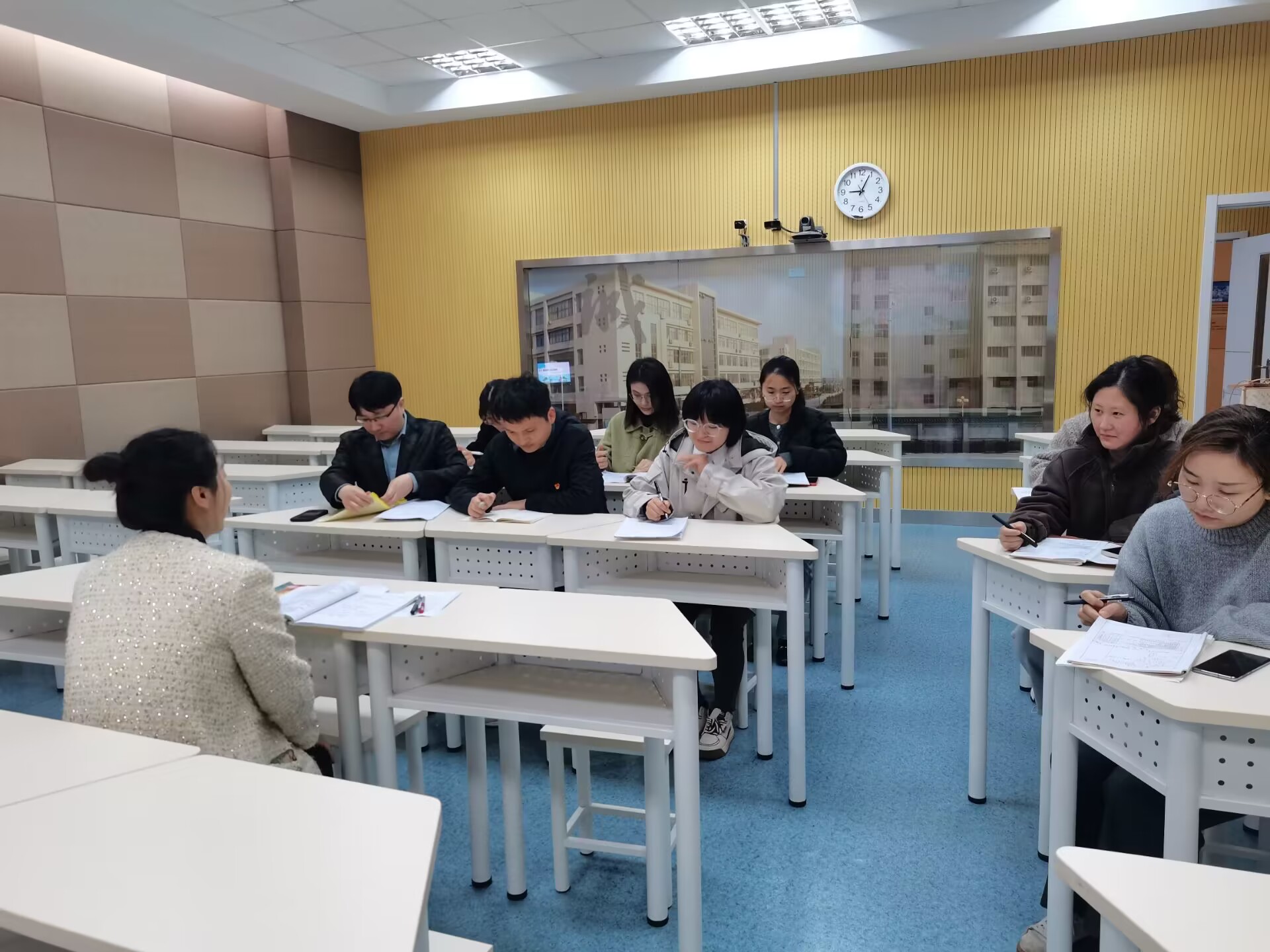 胡慧带领先后来到省前黄高中国际分校的教学楼、实验室、国际交流处等开展调研。通过交流,了解到高中生的思政课课堂教学、活动教学、课程思政等教学的主要模式,并在录播室现场听了一堂精彩的思政课。课程结束后,三位老师与省前黄高中的思政课教师就本次思政课的课堂情况、课程设计与内容、存在的问题和难点进行交流。大家从高中与高职院校在教材、学情等方面的差异入手,结合教学目标、教学方法和教学过程等方面,就如何切实推进思政课一体化建设的教学思路和设计展开深入探讨交流。濮扬表示,此次活动有效地增进了校际之间的交流,双方学校可以进一步搭建平台,整合资源与力量建立良好的沟通交流机制,积极推动大中小学思政课一体化建设的研究与实践活动。