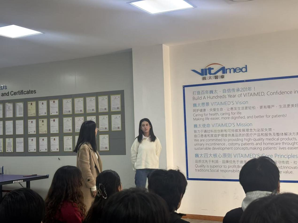 销售负责人向师生系统介绍了公司的发展历程、业务布局与企业文化,并分享了医疗器械跨境贸易的特点与趋势。为增强交流的延续性与真实感,企业还邀请已在该公司实习的南非留学生进行线上连线,分享其工作内容与成长体会,为在场学生提供了生动的跨境就业参考。