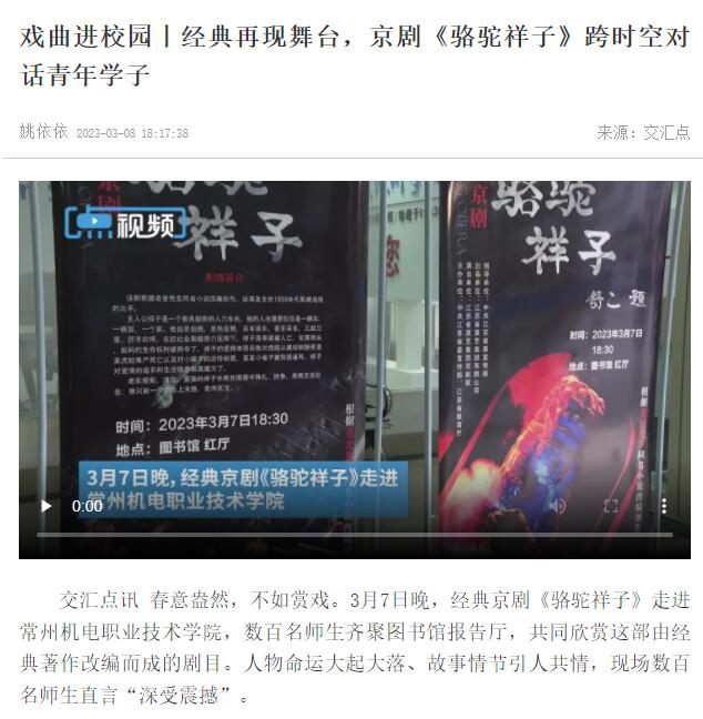 “现在我们能够接触到戏曲、接触到传统文化的方式有很多,比如抖音、B站、微信等。中国文化博大精深,每一次接触新的文化,都让我感觉自己原来只了解中华文化的冰山一角。”电气自动化专业大二学生田佳怡表示,作为“00后”,自己有责任有义务通过新媒体、校园活动、社交媒体等让更多人看到传统文化的光和热。戏曲进校园活动本身,也是给青年学子一次精神滋养。常州机电职业技术学院艺术教育中心主任王伟每年都很期待戏曲进校园活动,“传统戏曲本身既承载了传统文化,也承载了人文精神,本次《骆驼祥子》走进同学们中,通过对主人公悲剧人生的共情,同学们自身对社会、对自我价值的认识也会潜移默化地发生改变,对同学们而言是一堂很好的德育美育课。”