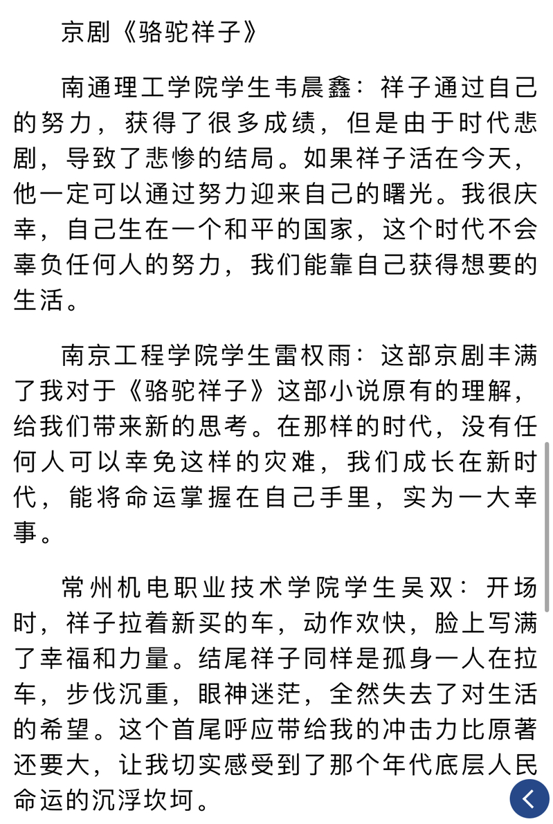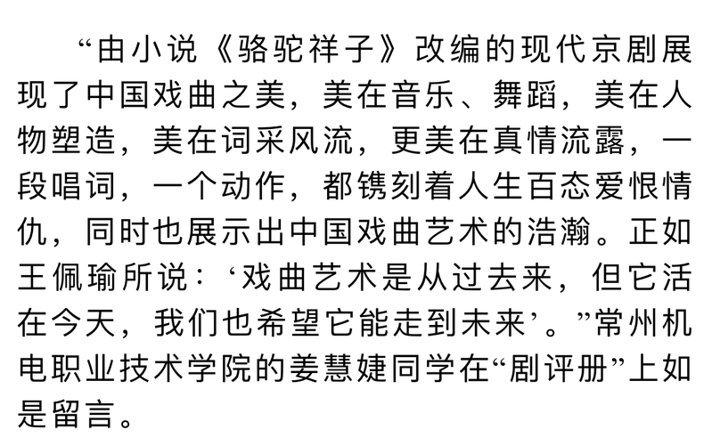 “由小说《骆驼祥子》改编的现代京剧展现了中国戏曲之美,美在音乐、舞蹈,美在人物塑造,美在词采风流,更美在真情流露,一段唱词,一个动作,都镌刻着人生百态爱恨情仇,同时也展示出中国戏曲艺术的浩瀚。正如王佩瑜所说:‘戏曲艺术是从过去来,但它活在今天,我们也希望它能走到未来’。”常州机电职业技术学院的姜慧婕同学在“剧评册”上如是留言。