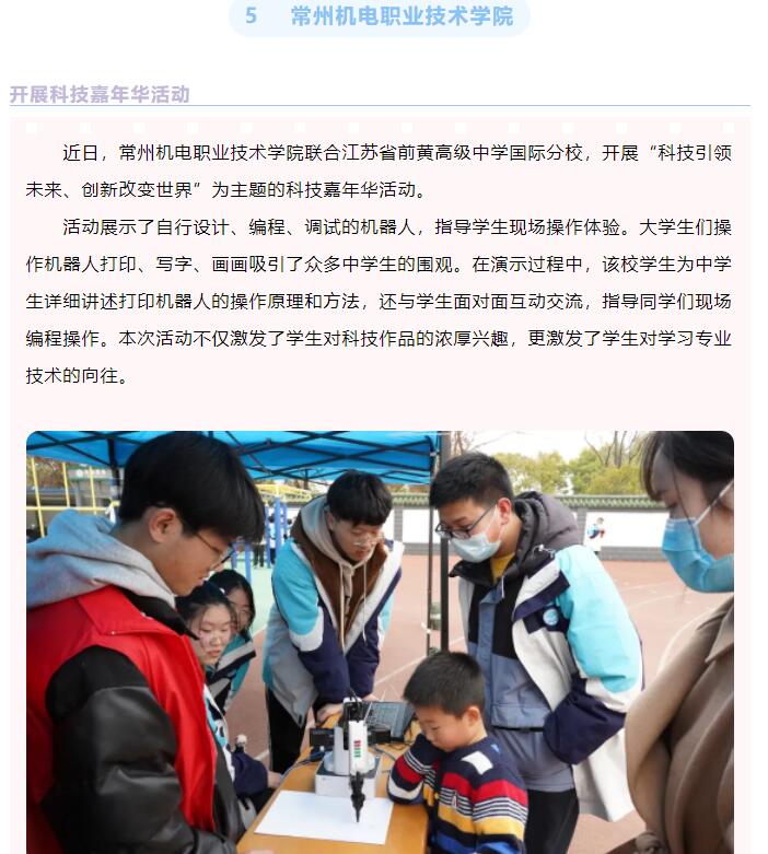 近日,常州机电职业技术学院联合江苏省前黄高级中学国际分校,开展“科技引领未来、创新改变世界”为主题的科技嘉年华活动。