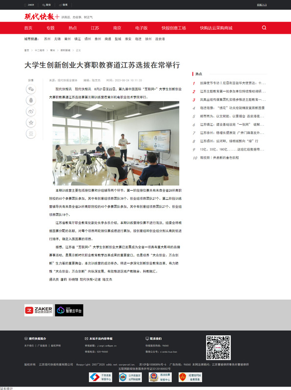 现代快报讯 8月21日至22日,第九届中国国际“互联网+”大学生创新创业大赛职教赛道江苏选拔赛第三期训练营在常州机电职业技术学院举行。