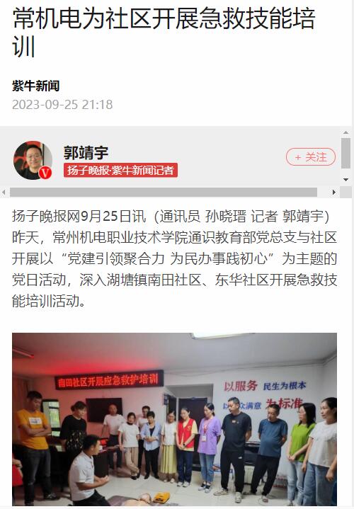 扬子晚报网9月25日讯(通讯员 孙晓瑨 记者 郭靖宇)昨天,常州机电职业技术学院通识教育部党总支与社区开展以“党建引领聚合力 为民办事践初心”为主题的党日活动,深入湖塘镇南田社区、东华社区开展急救技能培训活动。