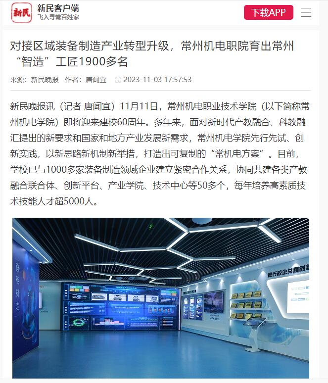 新民晚报讯(记者唐闻宜)11月11日,常州机电职业技术学院(以下简称常州机电学院)即将迎来建校60周年。多年来,面对新时代产教融合、科教融汇提出的新要求和国家和地方产业发展新需求,常州机电学院先行先试、创新实践,以新思路新机制新举措,打造出可复制的“常机电方案”。目前,学校已与1000多家装备制造领域企业建立紧密合作关系,协同共建各类产教融合联合体、创新平台、产业学院、技术中心等50多个,每年培养高素质技术技能人才超5000人。