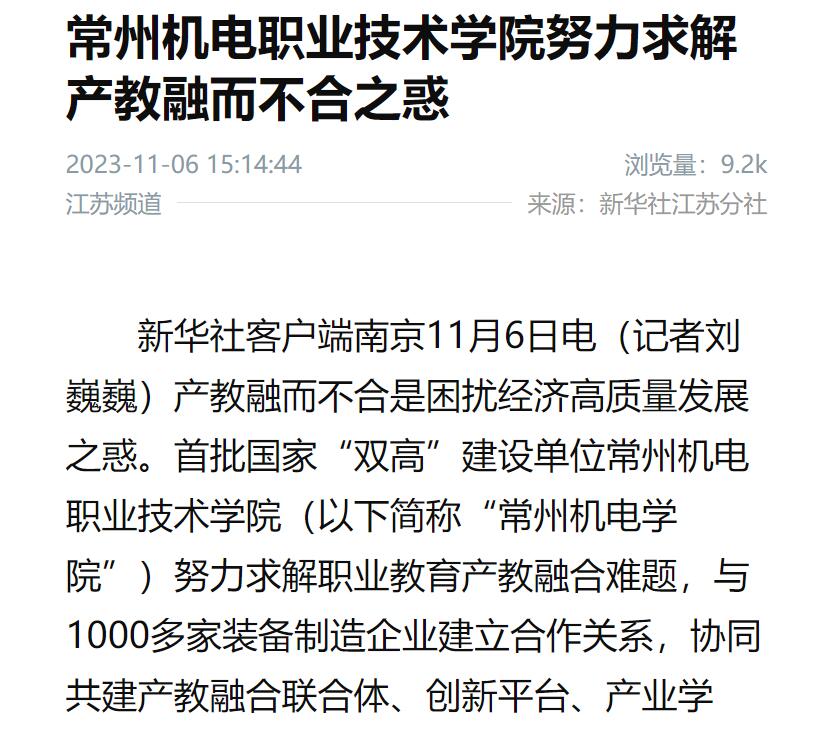 新华社客户端南京11月6日电(记者刘巍巍)产教融而不合是困扰经济高质量发展之惑。首批国家“双高”建设单位常州机电职业技术学院(以下简称“常州机电学院”)努力求解职业教育产教融合难题,与1000多家装备制造企业建立合作关系,协同共建产教融合联合体、创新平台、产业学院、技术中心等50多个,每年培养高素质技术技能人才超5000名,为我国装备制造产业智能化、数字化、绿色化转型发展贡献力量。