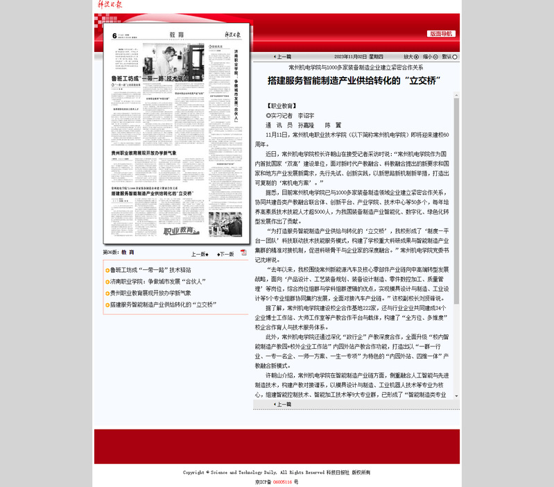 常州机电学院与1000多家装备制造企业建立紧密合作关系搭建服务智能制造产业供给转化的“立交桥”