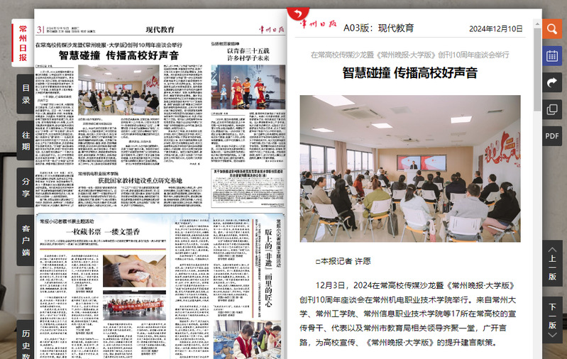12月3日,2024在常高校传媒沙龙暨《常州晚报·大学版》创刊10周年座谈会在常州机电职业技术学院举行。来自常州大学、常州工学院、常州信息职业技术学院等17所在常高校的宣传骨干、代表以及常州市教育局相关领导齐聚一堂,广开言路,为高校宣传、《常州晚报·大学版》的提升建言献策。
