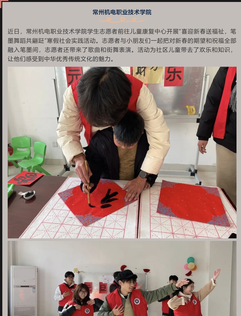 近日,常州机电职业技术学院学生志愿者前往儿童康复中心开展“喜迎新春送福祉,笔墨舞蹈共翩跹”寒假社会实践活动。志愿者与小朋友们一起把对新春的期望和祝福全部融入笔墨间,志愿者还带来了歌曲和街舞表演。活动为社区儿童带去了欢乐和知识,让他们感受到中华优秀传统文化的魅力。