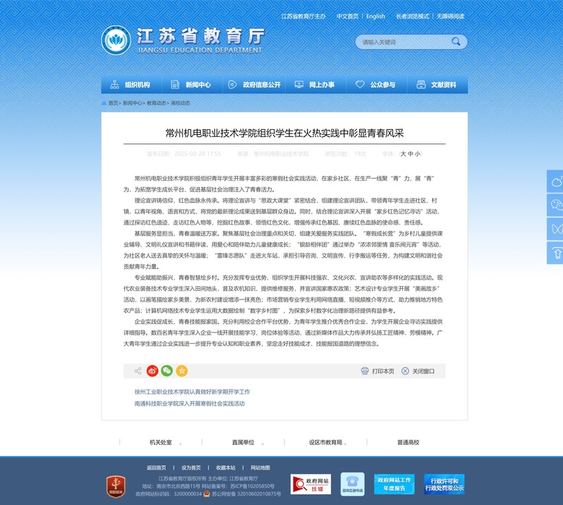 常州机电职业技术学院积极组织青年学生开展丰富多彩的寒假社会实践活动,在家乡社区、在生产一线聚“青”力,展“青”为,为拓宽学生成长平台、促进基层社会治理注入了青春活力。