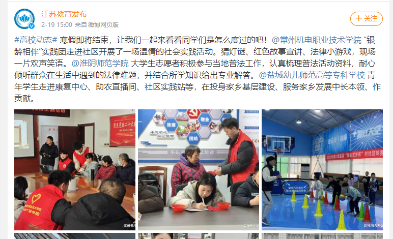 #高校动态# 寒假即将结束,让我们一起来看看同学们是怎么度过的吧!@常州机电职业技术学院 “银龄相伴”实践团走进社区开展了一场温情的社会实践活动。猜灯谜、红色故事宣讲、法律小游戏,现场一片欢声笑语。