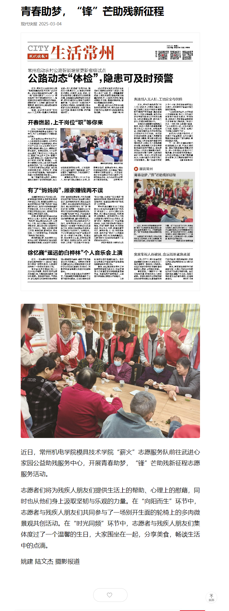 近日,常州机电学院模具技术学院“薪火”志愿服务队前往武进心家园公益助残服务中心,开展青春助梦,“锋”芒助残新征程志愿服务活动。