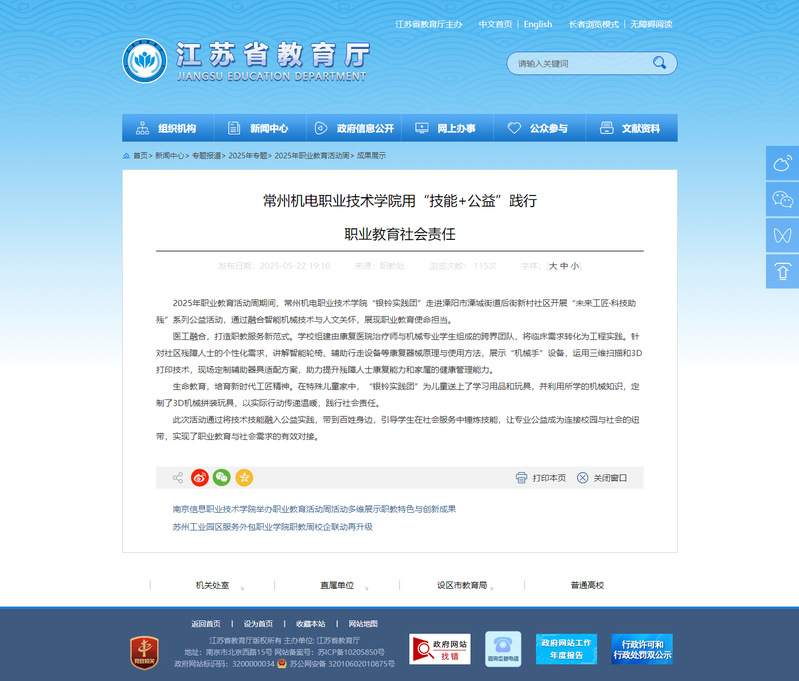 2025年职业教育活动周期间,常州机电职业技术学院“银铃实践团”走进溧阳市溧城街道后街新村社区开展“未来工匠·科技助残”系列公益活动,通过融合智能机械技术与人文关怀,展现职业教育使命担当。