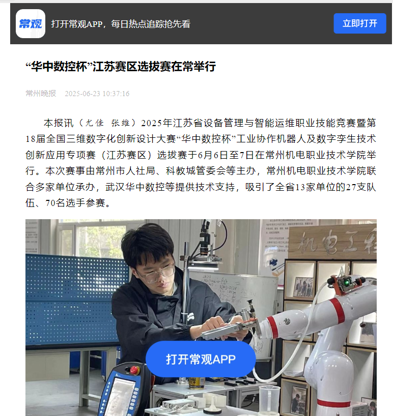 2025年江苏省设备管理与智能运维职业技能竞赛暨第18届全国三维数字化创新设计大赛“华中数控杯”工业协作机器人及数字孪生技术创新应用专项赛(江苏赛区)选拔赛于6月6日至7日在常州机电职业技术学院举行。本次赛事由常州市人社局、科教城管委会等主办,常州机电职业技术学院联合多家单位承办,武汉华中数控等提供技术支持,吸引了全省13家单位的27支队伍、70名选手参赛。