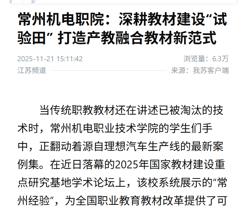 当传统职教教材还在讲述已被淘汰的技术时,常州机电职业技术学院的学生们手中,正翻动着源自理想汽车生产线的最新案例集。在近日落幕的2025年国家教材建设重点研究基地学术论坛上,该校系统展示的“常州经验”,为全国职业教育教材改革提供了可复制的创新样本。