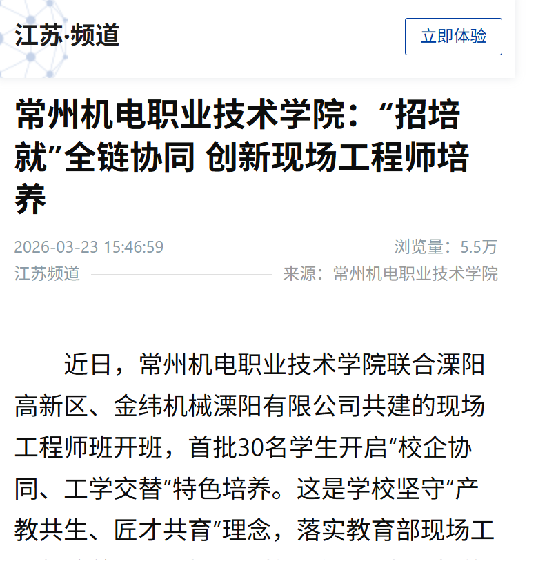 近日,常州机电职业技术学院联合溧阳高新区、金纬机械溧阳有限公司共建的现场工程师班开班,首批30名学生开启“校企协同、工学交替”特色培养。这是学校坚守“产教共生、匠才共育”理念,落实教育部现场工程师培养项目、推动职教与产业同频共振的生动实践。