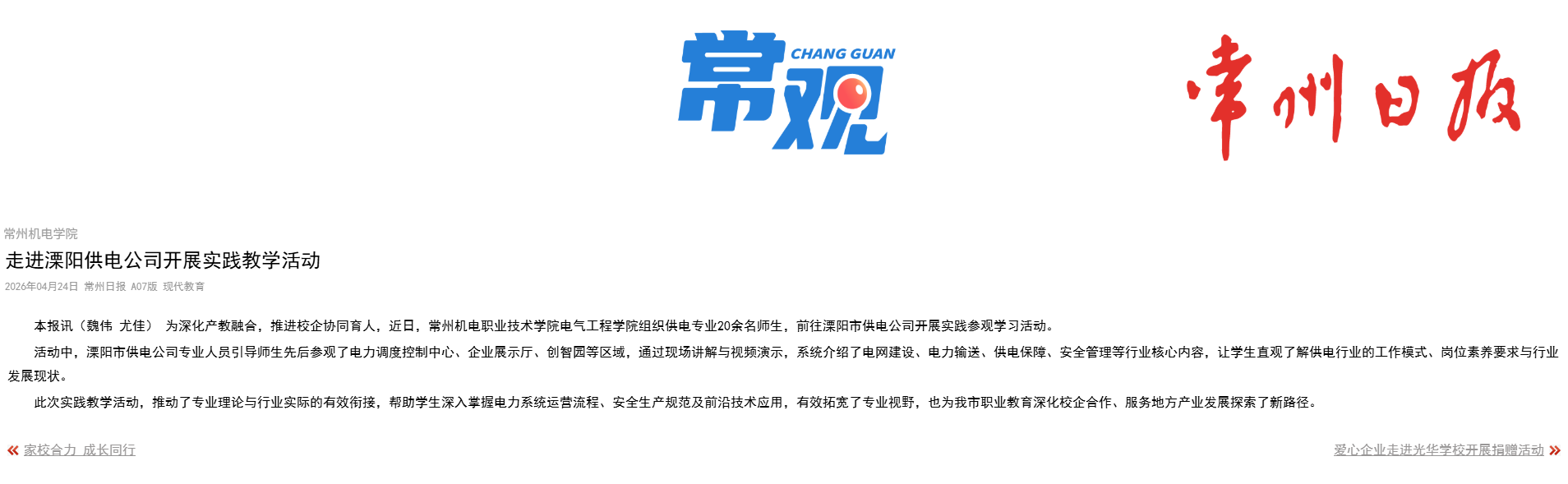 常州机电学院走进溧阳供电公司开展实践教学活动