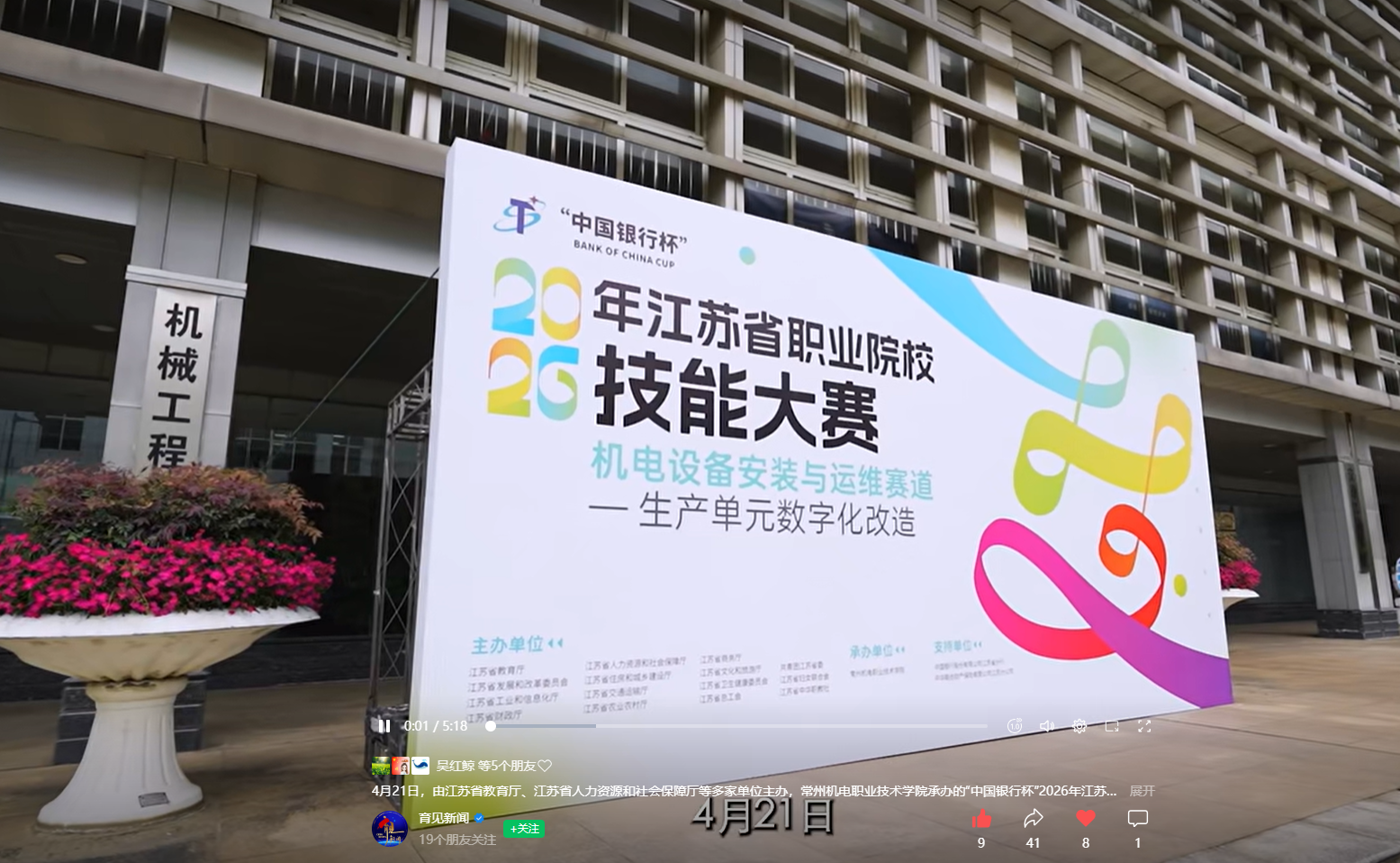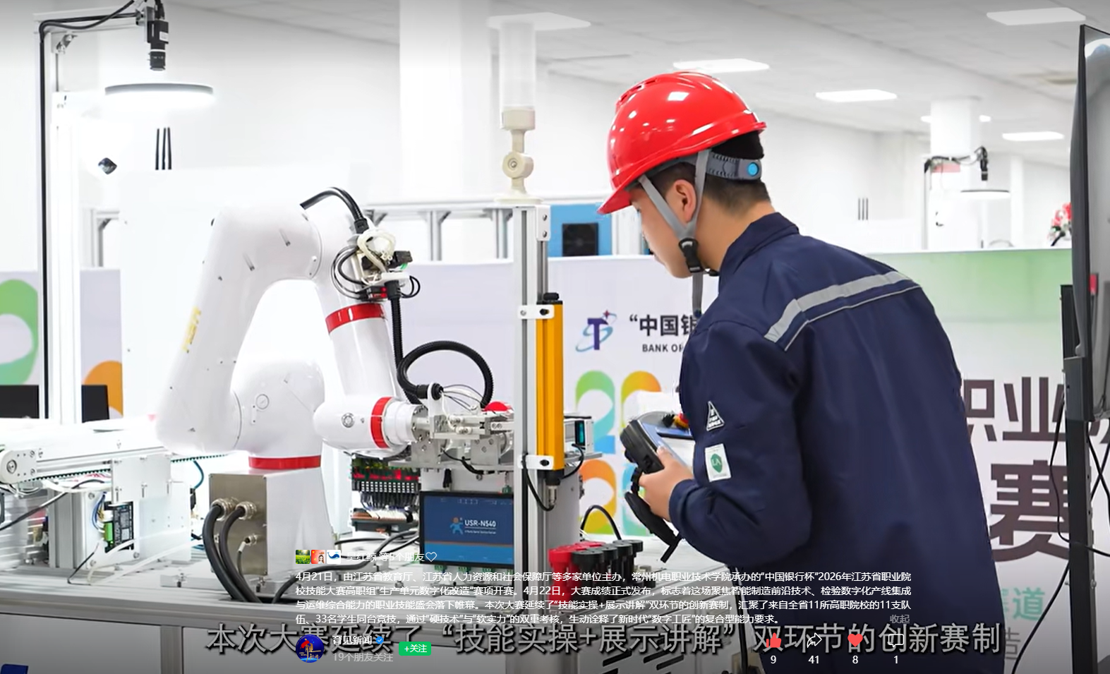 4月21日,由江苏省教育厅、江苏省人力资源和社会保障厅等多家单位主办,常州机电职业技术学院承办的“中国银行杯”2026年江苏省职业院校技能大赛高职组“生产单元数字化改造”赛项开赛。4月22日,大赛成绩正式发布,标志着这场聚焦智能制造前沿技术、检验数字化产线集成与运维综合能力的职业技能盛会落下帷幕。本次大赛延续了“技能实操+展示讲解”双环节的创新赛制,汇聚了来自全省11所高职院校的11支队伍、33名学生同台竞技,通过“硬技术”与“软实力”的双重考核,生动诠释了新时代“数字工匠”的复合型能力要求。