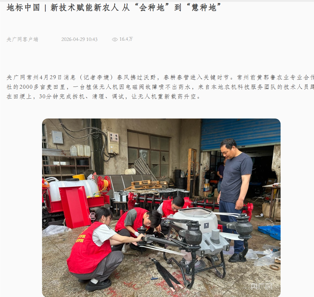 央广网常州4月29日消息(记者李婕)春风拂过沃野,春耕春管进入关键时节。常州前黄郭鲁农业专业合作社的2000多亩麦田里,一台植保无人机因电磁阀故障喷不出药水,来自本地农机科技服务团队的技术人员蹲在田埂上,30分钟完成拆机、清理、调试,让无人机重新载药升空。
