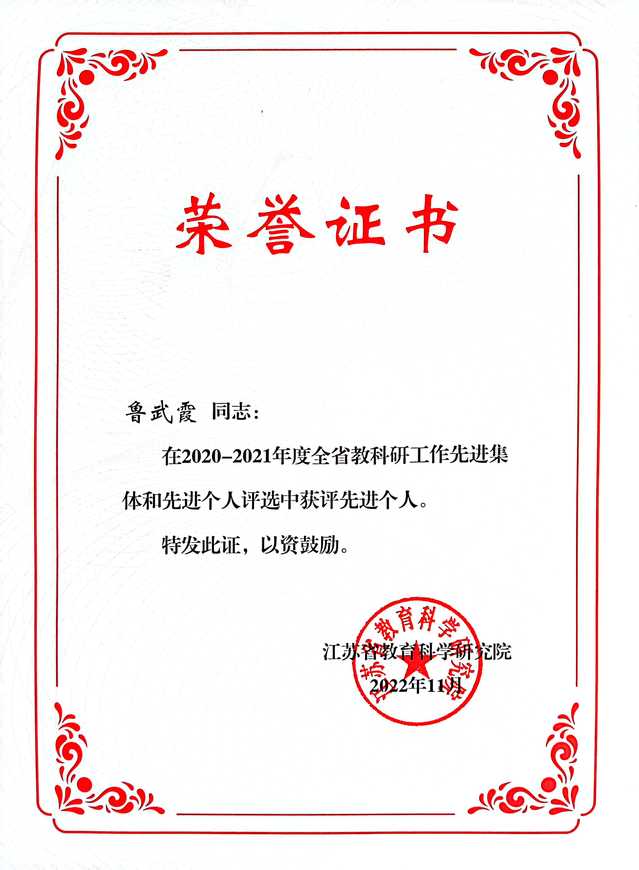 近日,江苏省教育科学研究院公布了2020—2021年度“江苏省教科研工作先进集体和先进个人”的名单,我校荣获省教科研先进集体荣誉称号,高职研究院研究员鲁武霞被评为省教科研先进个人。