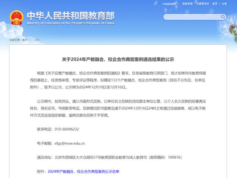 本次遴选在各省级教育行政部门、各计划单列市教育局推荐的基础上,经资格审查、专家评议等程序,选定133个产教融合、校企合作典型案例,江苏省入选6个案例。