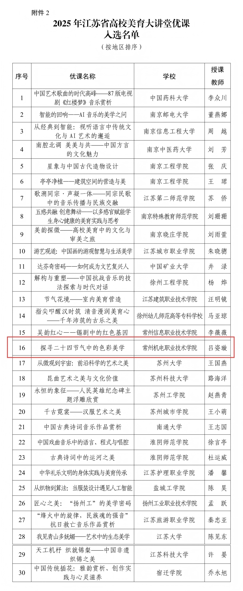 12月16日,江苏省教育厅公示了2025年江苏省高校美育大讲堂优课入选名单,共有30门课程入选。由我校团委兼职副书记、创意设计学院辅导员吕姿璇讲授的优课《探寻二十四节气中的色彩美学》在全省85所高校推荐的132门课程中脱颖而出,成功入选。
