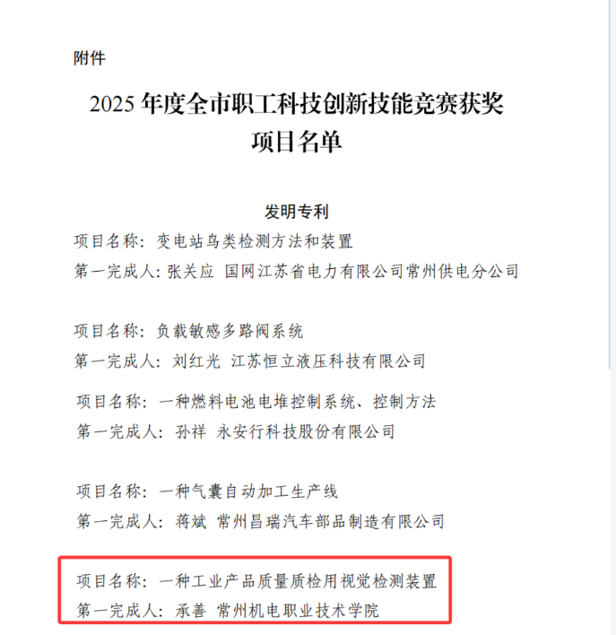 近日,常州市总工会联合市科技局、市工信局等五部门共同举办的2025年度全市职工科技创新技能竞赛获奖名单公布。我校推选的《一种工业产品质量质检用视觉检测装置》获“发明专利”专项奖。