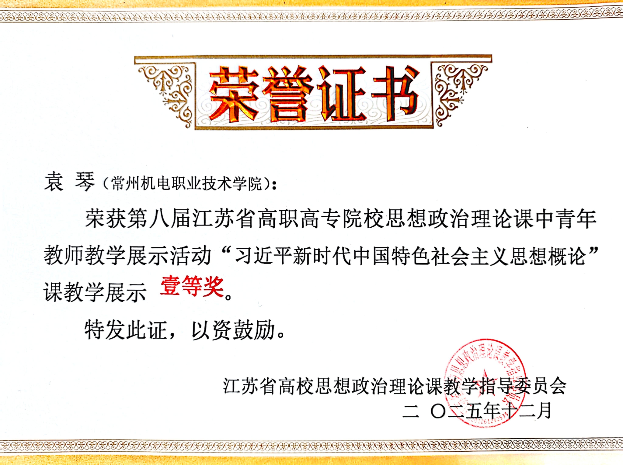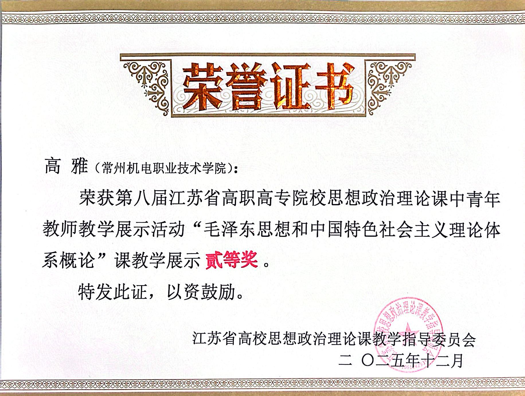 12月13日至14日,第八届江苏省高职高专院校思想政治理论课中青年教师教学展示活动落下帷幕。本次教学展示活动按4门课程分为4个组别,经过初赛选拔,全省共有112名教师进入决赛。我校马克思主义学院教师袁琴获《习近平新时代中国特色社会主义思想概论》组一等奖,高雅获《毛泽东思想和中国特色社会主义理论体系概论》组二等奖。