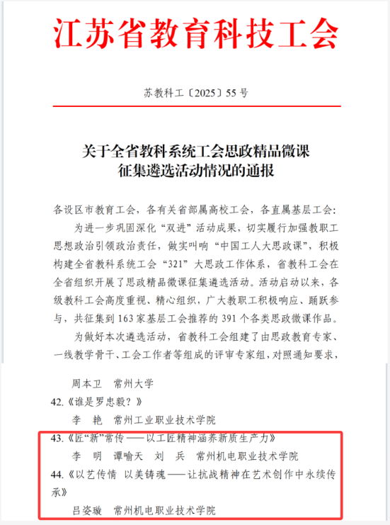 近日,江苏省教育科技工会公布了2025年全省教科系统工会思政精品微课遴选结果。我校马克思主义学院李明、谭喻天、刘兵的《匠“新”常传——以工匠精神涵养新质生产力》与创意设计学院吕姿璇的《以艺传情 以美铸魂——让抗战精神在艺术创作中永续传承》成功入选。