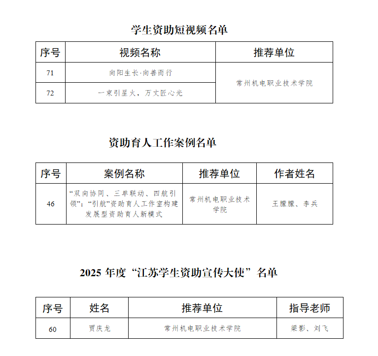 由机械工程学院季黄源同学创作的《向阳生长·向善而行》、经济管理学院丁振航同学创作的《一束引信火,万丈匠心光》资助短视频入选优秀学生短视频作品,电气工程学院王朦朦、李兵老师撰写的案例《“双向协同、三单联动、四航引领”:“引航”资助育人工作室构建发展型资助育人新模式》入选典型案例。信息工程学院2023级贾庆龙同学获评“江苏学生资助宣传大使”,是我校第三次获此殊荣。