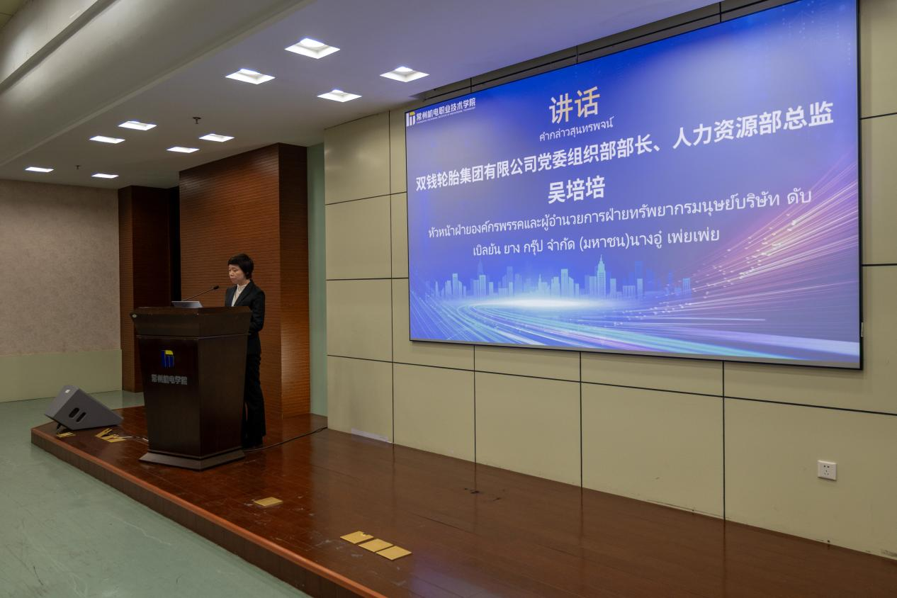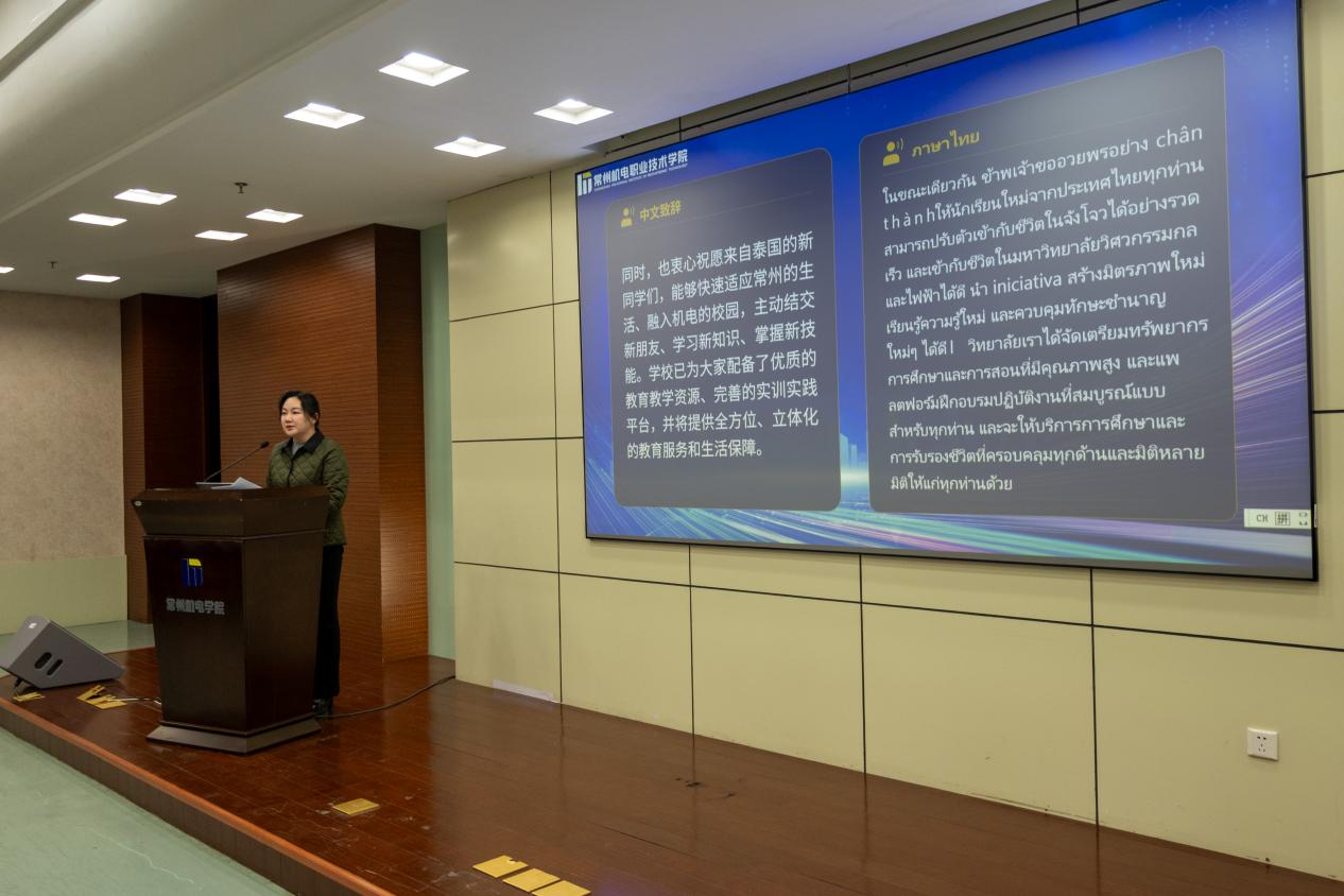 刘畅在致辞中对泰方来宾表示热烈欢迎,向双钱轮胎等长期以来支持中泰职业教育合作的企业伙伴表示衷心感谢。她回顾了学校自2022年起,依托校企合作平台与泰国院校开展工业机器人教学、师资互派等合作的历程。她表示,学校国际化办学基础扎实,已累计培养来自45个国家和地区的800余名留学生。此次三方共建海外工程技术学院并开设国际现场工程师班,标志着中泰职业教育合作从校际交流,迈入了“校校企”深度协同、产教融合的新阶段。学校将整合优质教学资源与实训平台,为泰国留学生成长成才提供坚实保障,助力中泰产业升级与人文交流。